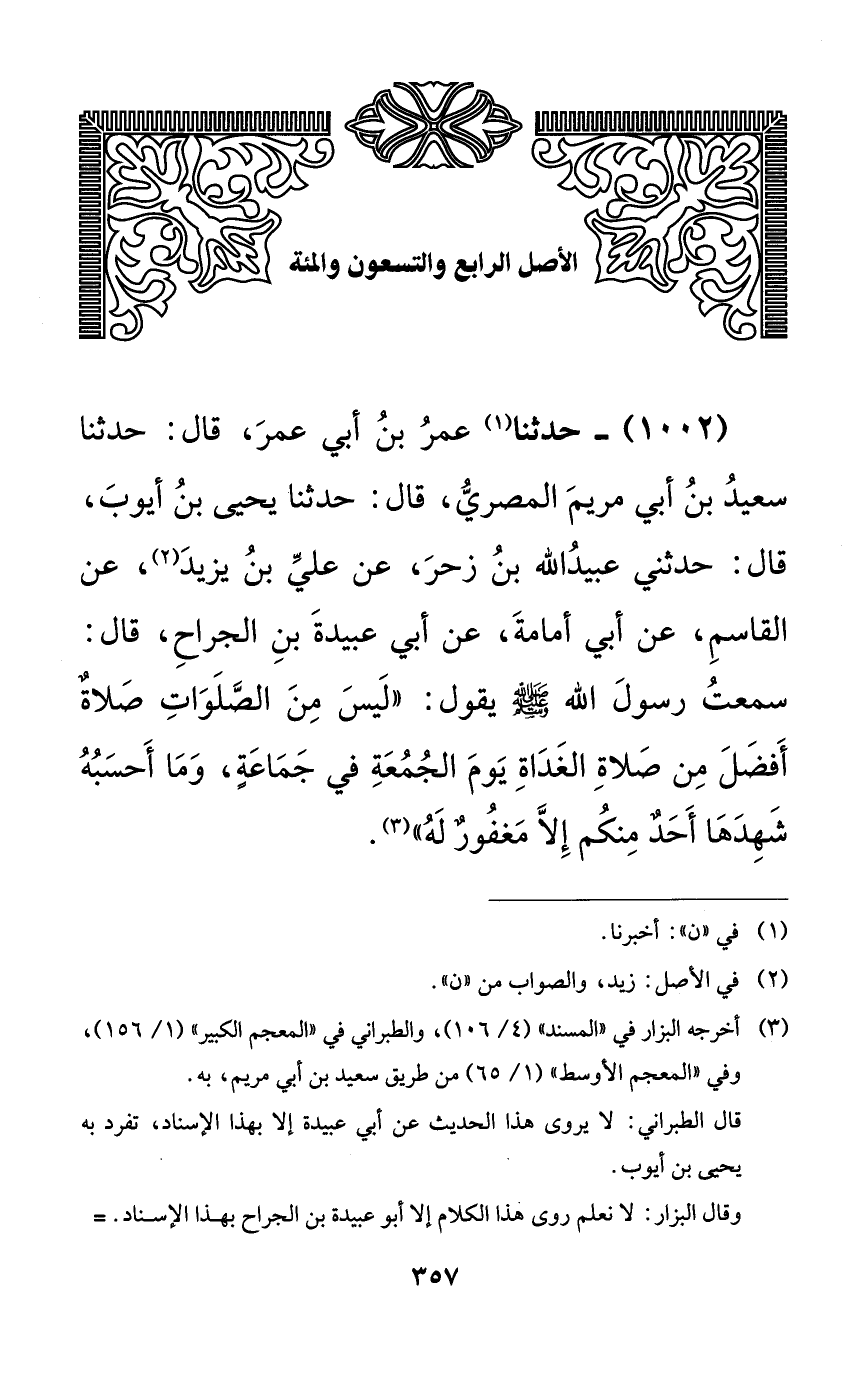 1002 - حدثنا عمر بن أبي عمر، قال: حدثنا سعيد بن أبي مريم المصري، قال: حدثنا يحيى بن أيوب، قال: حدثني عبيد الله بن زحر، عن علي بن يزيد، عن القاسم، عن أبي أمامة، عن أبي عبيدة بن الجراح، قال: سمعت رسول الله صلى الله عليه وسلم يقول: ((ليس من الصلوات صلاةٌ أفضل من صلاة الغداة يوم الجمعة في جماعةٍ، وما أحسبه شهدها أحدٌ منكم إلا مغفورٌ له)).