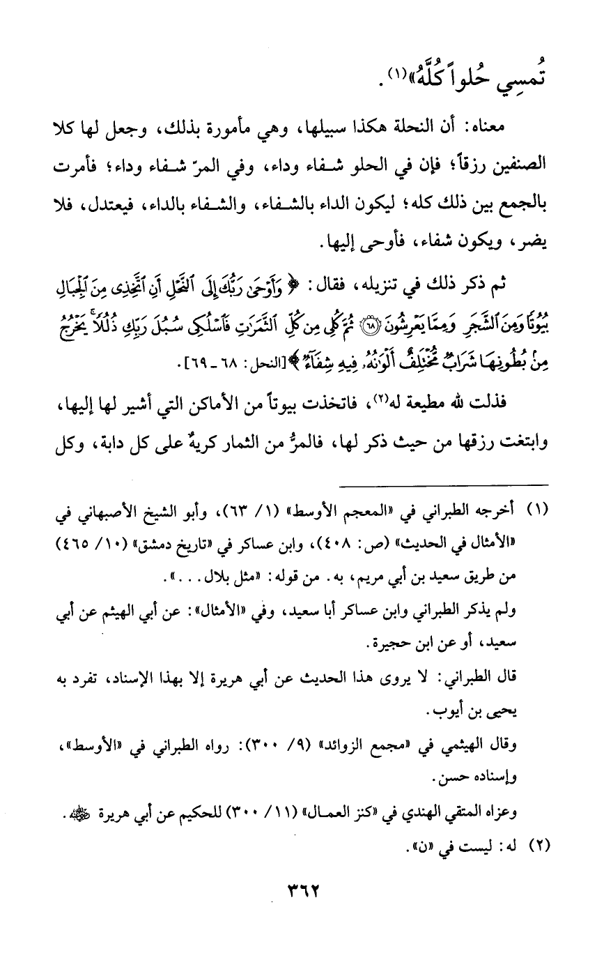 ثم ذكر ذلك في تنزيله، فقال: {وأوحى ربك إلى النحل أن اتخذي من الجبال بيوتاً ومن الشجر ومما يعرشون. ثم كلي من كل الثمرات فاسلكي سبل ربك ذللاً يخرج من بطونها شرابٌ مختلفٌ ألوانه فيه شفاءٌ}.