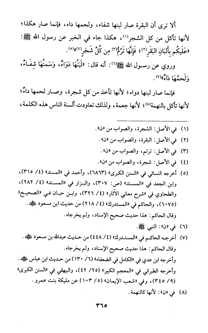 ألا ترى أن البقرة صار لبنها شفاء، ولحمها داء، فإنما صار هكذا؛ لأنها تأكل من كل الشجر، هكذا جاء في الخبر عن رسول الله صلى الله عليه وسلم: ((عليكم بألبان البقر؛ فإنها ترم من كل شجرٍ)).