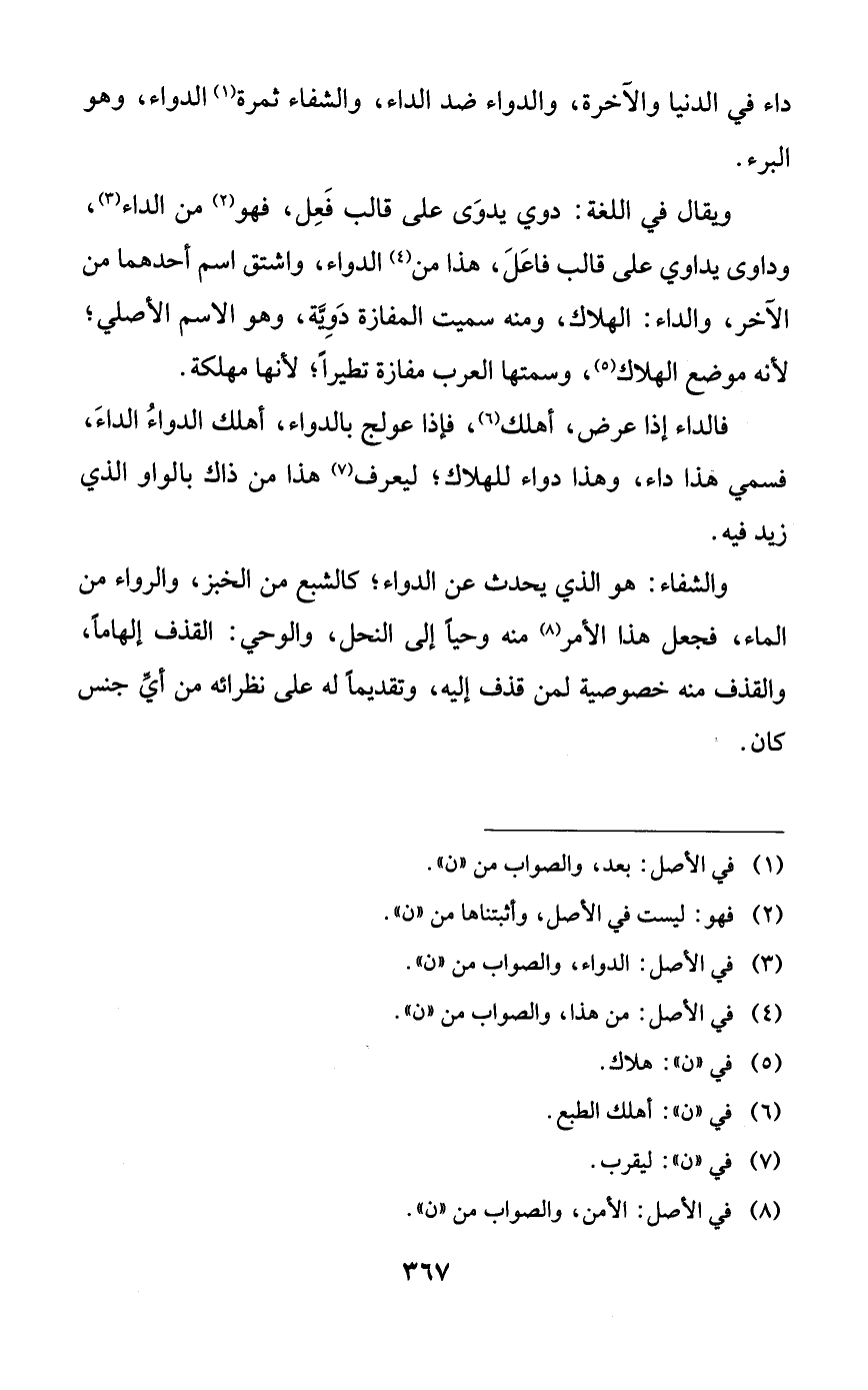 ويقال في اللغة: دوي يدوى على قالب فعل، فهو من الداء، وداوى يداوي على قالب فاعل، هذا من الدواء، واشتق اسم أحدهما من الآخر، والداء: الهلاك، ومنه سميت المفازة دوية، وهو الاسم الأصلي؛ لأنه موضع الهلاك، وسمتها العرب مفازة تطيراً؛ لأنها مهلكة.