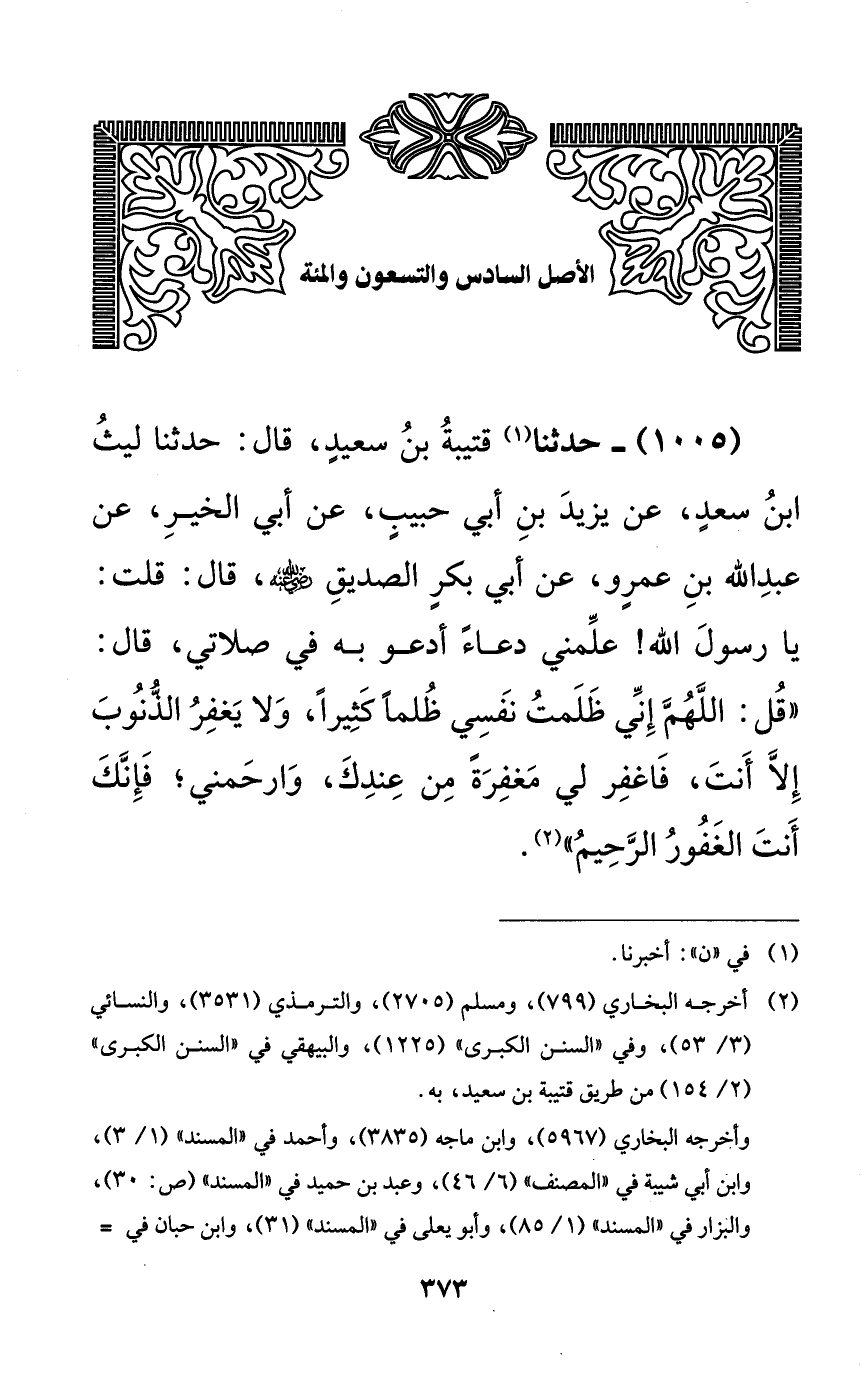 1005 - حدثنا قتيبة بن سعيدٍ، قال: حدثنا ليث ابن سعدٍ، عن يزيد بن أبي حبيب، عن أبي الخير، عن عبد الله بن عمرٍو، عن أبي بكر الصديق رضي الله عنه، قال: قلت: يا رسول الله! علمني دعاءً أدعو به في صلاتي، قال: ((قل: اللهم إني ظلمت نفسي ظلماً كثيراً، ولا يغفر الذنوب إلا أنت، فاغفر لي مغفرةً من عندك، وارحمني؛ فإنك أنت الغفور الرحيم)).