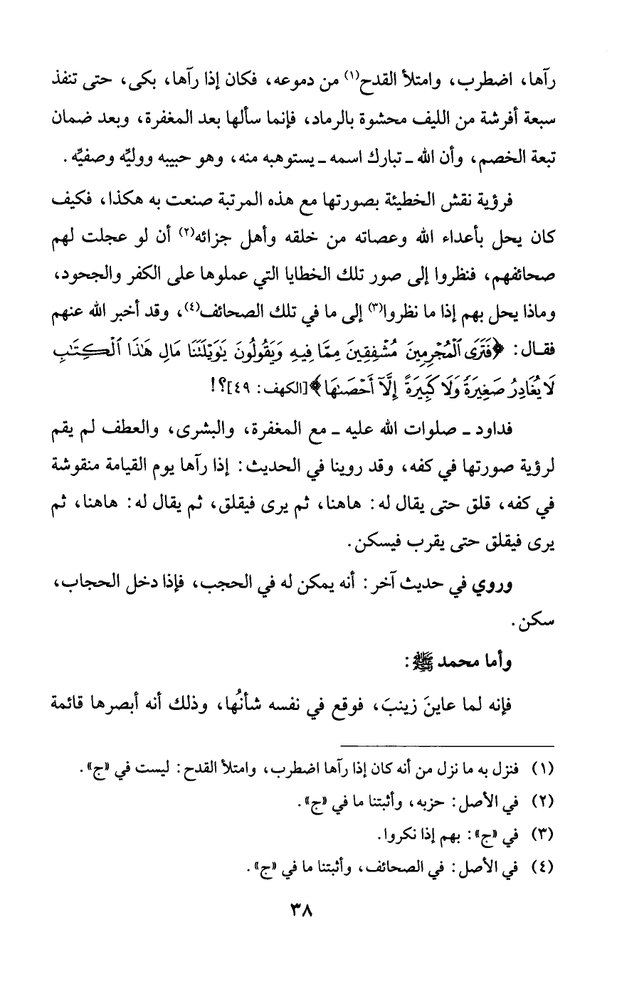 فداود -صلوات الله عليه- مع المغفرة، والبشرى، والعطف لم يقم لرؤية صورتها في كفه، وقد روينا في الحديث: إذا رآها يوم القيامة منقوشة في كفه، قلق حتى يقال له: هاهنا، ثم يرى فيقلق، ثم يقال له: هاهنا، ثم يرى فيقلق حتى يقرب فيسكن.