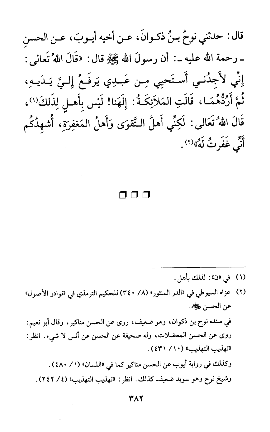 قال: حدثني نوح بن ذكوان، عن أخيه أيوب، عن الحسن -رحمة الله عليه-: أن رسول الله صلى الله عليه وسلم قال: ((قال الله تعالى: إني لأجدني أستحي من عبدي يرفع إلي يديه، ثم أردهما، قالت الملائكة: إلهنا! ليس بأهلٍ لذلك، قال الله تعالى: لكني أهل التقوى وأهل المغفرة، أشهدكم أني غفرت له)).