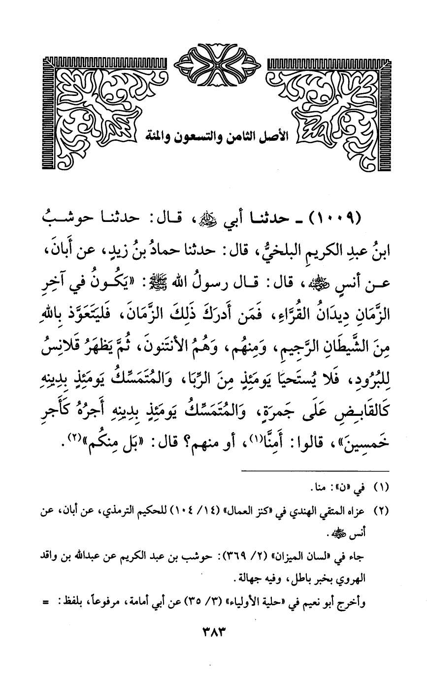 1009 - حدثنا أبي رحمه الله، قال: حدثنا حوشب ابن عبد الكريم البلخي، قال: حدثنا حماد بن زيدٍ، عن أبان، عن أنسٍ رضي الله عنه، قال: قال رسول الله صلى الله عليه وسلم: ((يكون في آخر الزمان ديدان القراء، فمن أدرك ذلك الزمان، فليتعوذ بالله من الشيطان الرجيم، ومنهم، وهم الأنتنون، ثم يظهر قلانس للبرود، فلا يستحيا يومئذٍ من الربا، والمتمسك يومئذٍ بدينه كالقابض على جمرةٍ، والمتمسك يومئذٍ بدينه أجره كأجر خمسين))، قالوا: أمنا، أو منهم؟ قال: ((بل منكم)).