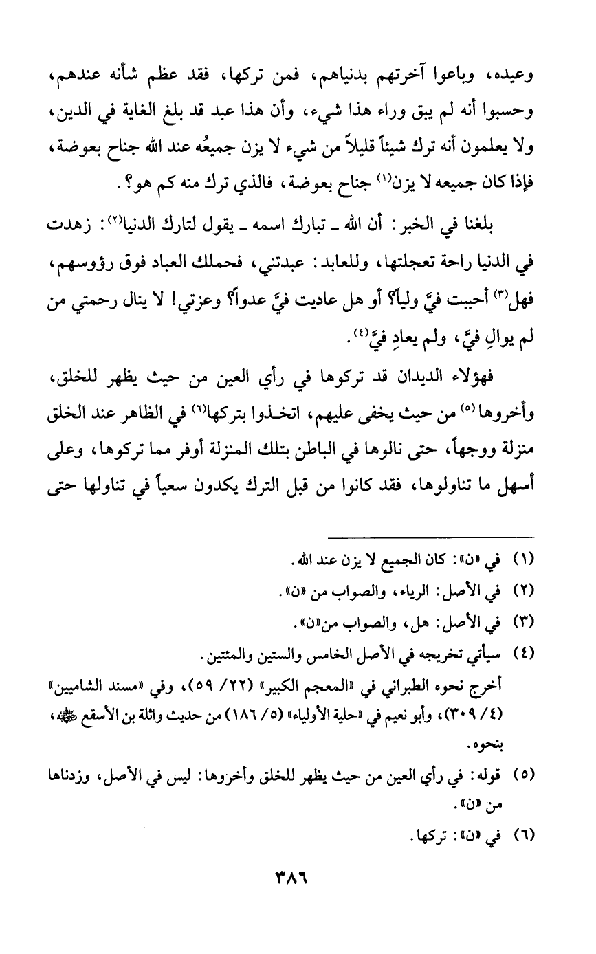 وعيده، وباعوا آخرتهم بدنياهم، فمن تركها، فقد عظم شأنه عندهم، وحسبوا أنه لم يبق وراء هذا شيء، وأن هذا عبد قد بلغ الغاية في الدين، ولا يعلمون أنه ترك شيئاً قليلاً من شيء لا يزن جمعيه عند الله جناح بعوضة، فإذا كان جميعه لا يزن جناح بعوضة، فالذي ترك منه كم هو؟.