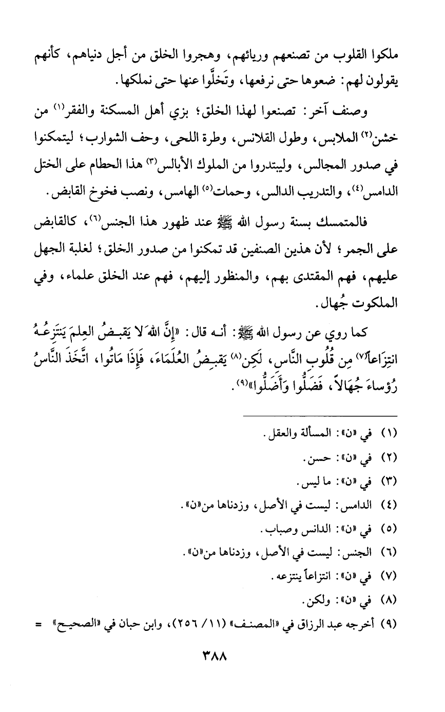 كما روي عن رسول الله صلى الله عليه وسلم: أنه قال: ((إن الله لا يقبض العلم ينتزعه انتزاعاً من قلوب الناس، لكن يقبض العلماء، فإذا ماتوا، اتخذ الناس رؤساء جهالاً، فضلوا وأضلوا)).