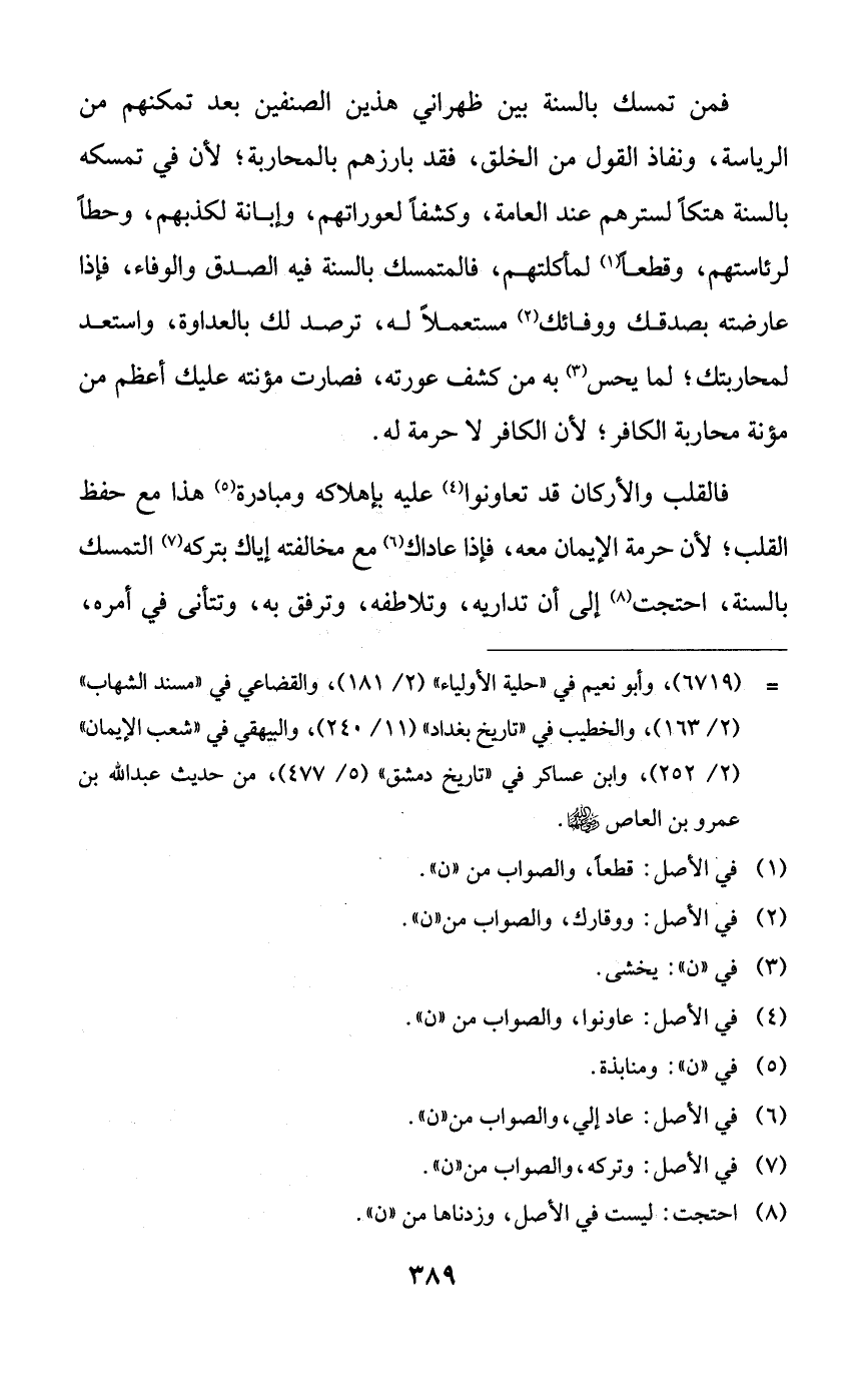 فمن تمسك بالسنة بين ظهراني هذين الصنفين بعد تمكنهم من الرياسة، ونفاذ القول من الخلق، فقد بارزهم بالمحاربة؛ لأن في تمسكه بالسنة هتكاً لسترهم عند العامة، وكشفاً لعوراتهم، وإبانة لكذبهم، وحطاً لرئاستهم، وقطعاً لمأكلتهم، فالمتمسك بالسنة فيه الصدق والوفاء، فإذا عارضته بصدقك ووفائك مستعملاً له، ترصد لك بالعدواة، واستعد لمحاربتك؛ لما يحس به من كشف عورته، فصارت مؤنته عليك أعظم من مؤنة محاربة الكافر؛ لأن الكافر لا حرمة له.