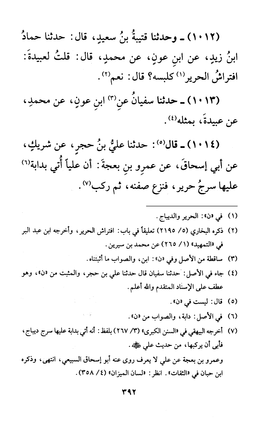 1012 - وحدثنا قتيبة بن سعيدٍ، قال: حدثنا حماد ابن زيدٍ، عن ابن عونٍ، عن محمدٍ، قال: قلت لعبيدة: افتراش الحرير كلبسه؟ قال: نعم.