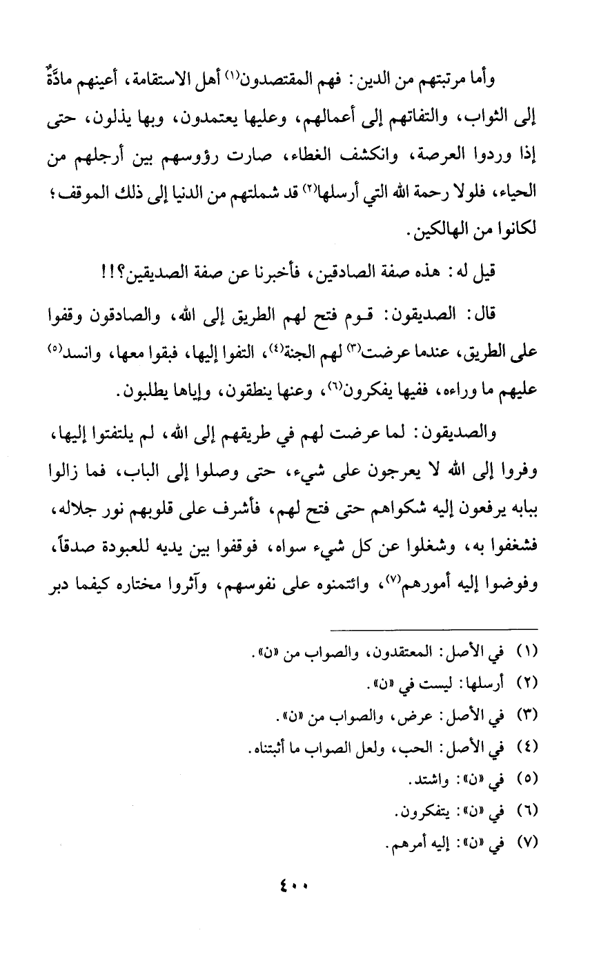 والصديقون: لما عرضت لهم في طريقهم إلى الله، لم يلتفتوا إليها، وفروا إلى الله لا يعرجون على شيء، حتى وصلوا إلى الباب، فما زالوا ببابه يرفعون إليه شكواهم حتى فتح لهم، فأشرف على قلوبهم نور جلاله، فشغفوا به، وشغلوا عن كل شيء سواه، فوقفوا بين يديه للعبودة صدقاً، وفوضوا إليه أمورهم، وائتمنوه على نفوسهم، وآثروا مختاره كيفما دبر