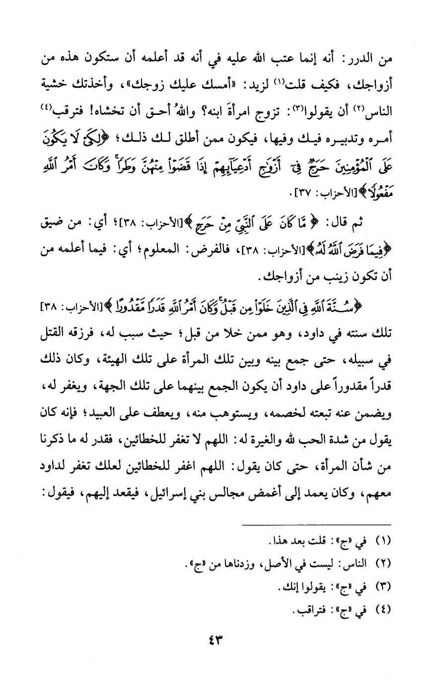 {سنة الله في الذين خلوا من قبل وكان أمر الله قدراً مقدوراً} تلك سنته في داود، وهو ممن خلا من قبل؛ حيث سبب له، فرزقه القتل في سبيله، حتى جمع بينه وبين تلك المرأة على تلك الهيئة، وكان ذلك قدراً مقدوراً على داود أن يكون الجمع بينهما على تلك الجهة، ويغفر له، ويضمن عنه تبعته لخصمه، ويستوهب منه، ويعطف على العبيد؛ فإنه كان يقول من شدة الحب لله والغيرة له: اللهم لا تغفر للخطائين، فقدر له ما ذكرنا من شأن المرأة، حتى كان يقول: اللهم اغفر للخطائين لعلك تغفر لداود معهم، وكان يعمد إلى أغمض مجالس بني إسرائيل، فيقعد إليهم، فيقول: