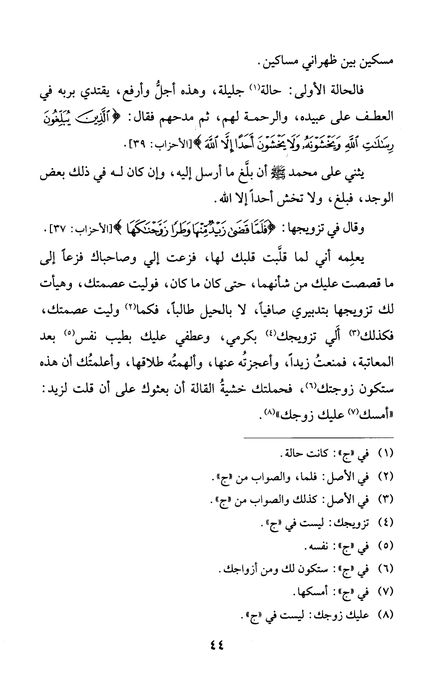 يعلمه أني لما قلبت قلبك لها، فزعت إلي وصاحباك فزعاً إلى ما قصصت عليك من شأنهما، حتى كان ما كان، فوليت عصمتك، وهيأت لك تزويجها بتدبيري صافياً، لا بالحيل طالباً، فكما وليت عصمتك، فكذلك ألي تزويجك بكرمي، وعطفي عليك بطيب نفس بعد المعاتبة، فمنعت زيداً، وأعجزته عنها، وألهمته طلاقها، وأعلمتك أن هذه ستكون زوجتك، فحملتك خشية القالة أن بعثوك على أن قلت لزيد: ((أمسك عليك زوجك)).