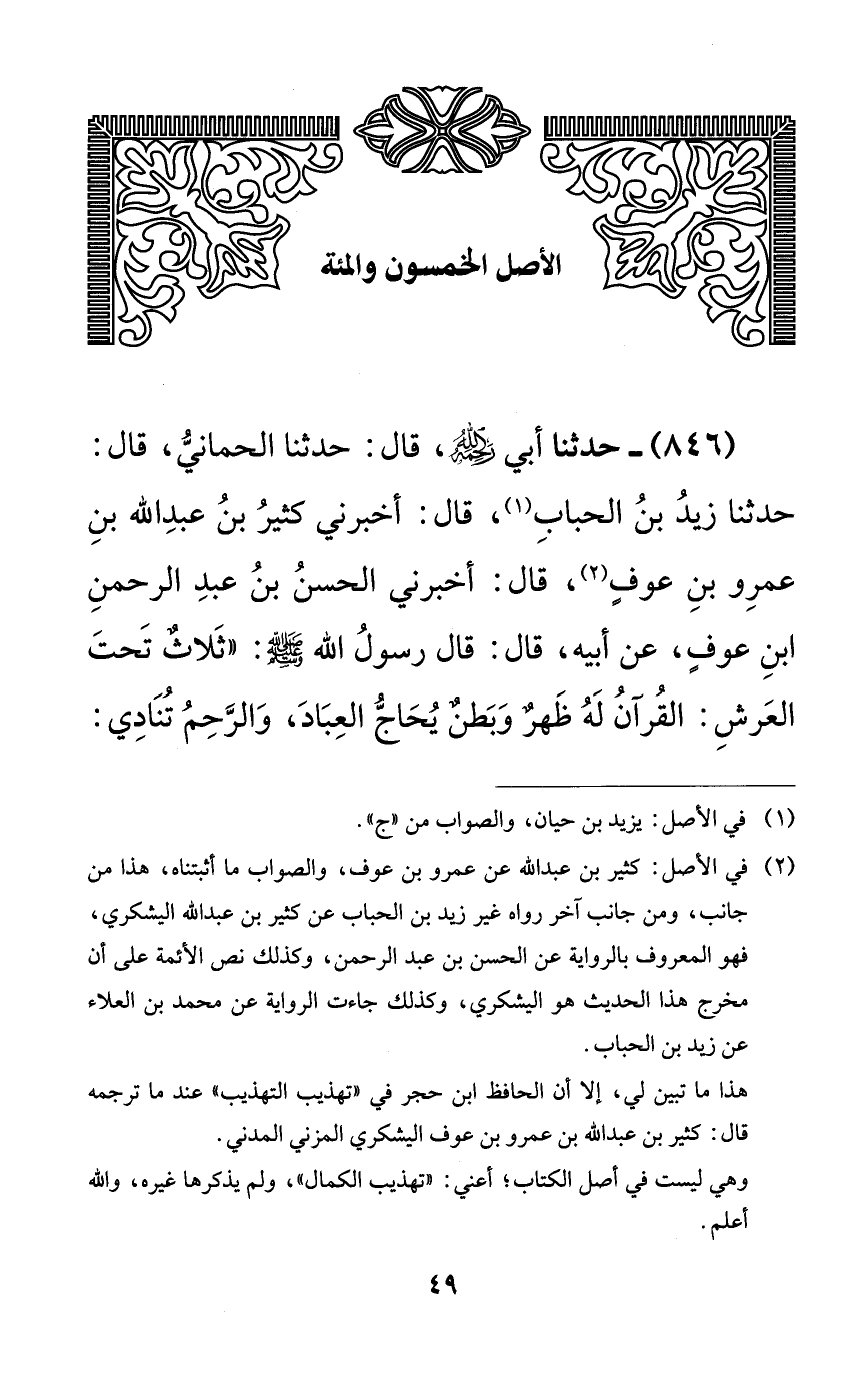 846 - حدثنا أبي رحمه الله، قال: حدثنا الحماني، قال: حدثنا زيد بن الحباب، قال: أخبرني كثير بن عبد الله بن عمرو بن عوفٍ، قال: أخبرني الحسن بن عبد الرحمن ابن عوفٍ، عن أبيه، قال: قال رسول الله صلى الله عليه وسلم: ((ثلاثٌ تحت العرش: القرآن له ظهرٌ وبطنٌ يحاج العباد، والرحم تنادي:
