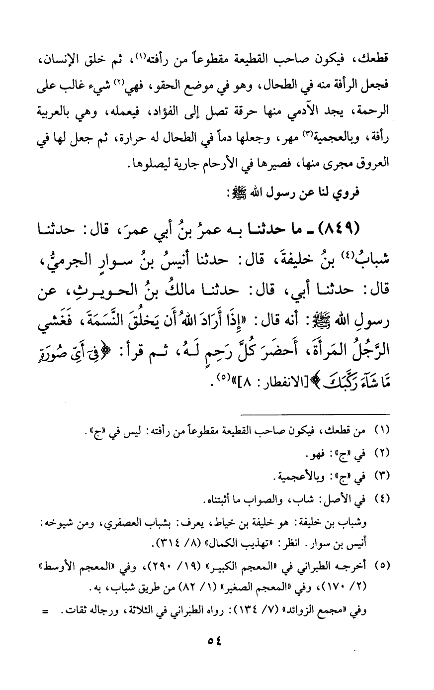 849 - ما حدثنا به عمر بن أبي عمر، قال: حدثنا شباب بن خليفة، قال: حدثنا أنيس بن سوارٍ الجرمي، قال: حدثنا أبي، قال: حدثنا مالك بن الحويرث، عن رسول الله صلى الله عليه وسلم: أنه قال: ((إذا أراد الله أن يخلق النسمة، فغشي الرجل المرأة، أحضر كل رحمٍ له، ثم قرأ: {في أي صورةٍ ما شاء ركبك})).