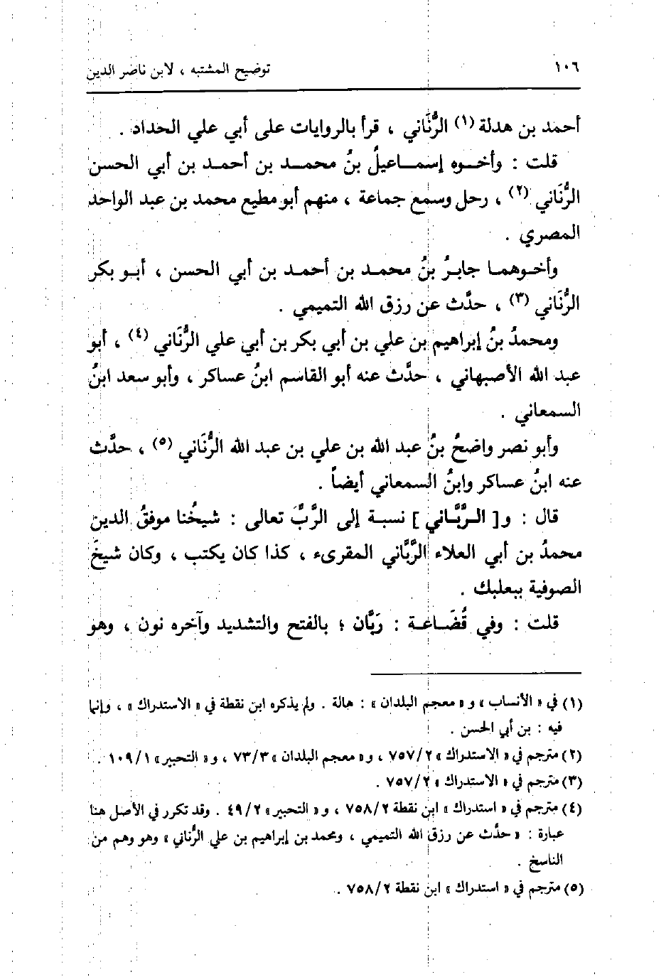 قَالَ: و [الرَّبَّاني] نِسْبَة إِلَى الرب تَعَالَى: شَيخنَا موفق الدّين مُحَمَّد بن أبي الْعَلَاء الرباني الْمُقْرِئ، كَذَا كَانَ يكْتب، وَكَانَ شيخ الصُّوفِيَّة ببعلبك.
