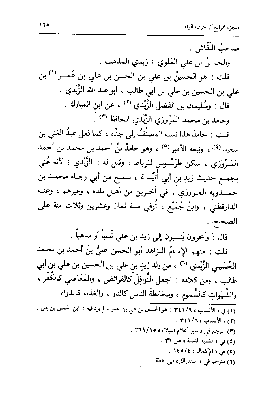 قلت: مِنْهُم الإِمَام الزَّاهِد أَبُو الْحسن عَليّ بن أَحْمد بن مُحَمَّد الْحُسَيْنِي الزيدي، من ولد زيد بن عَليّ بن الْحُسَيْن بن عَليّ بن أبي طَالب، وَمن كَلَامه: اجْعَل النَّوَافِل كالفرائض، والمعاصي كالكفر، والشهوات كالسموم، ومخالطة النَّاس كالنار، والغذاء كالدواء.