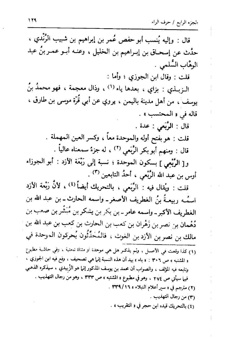قلت: وَيُقَال فِيهِ: الربعِي، بِالتَّحْرِيكِ أَيْضا، لِأَن ربعَة الأزد اسْمه ربيعَة بن الغطريف الْأَصْغَر _ واسْمه الْحَارِث _ بن عبد الله بن الغطريف الْأَكْبَر _ واسْمه عَامر _ بن بكر بن يشْكر بن مُبشر بن صَعب بن دهمان بن نصر بن زهران بن كَعْب بن الْحَارِث بن كَعْب بن عبد الله بن مَالك بن نصر بن الأزد بن الْغَوْث، فالمحدثون يحركون الْمُوَحدَة فِي