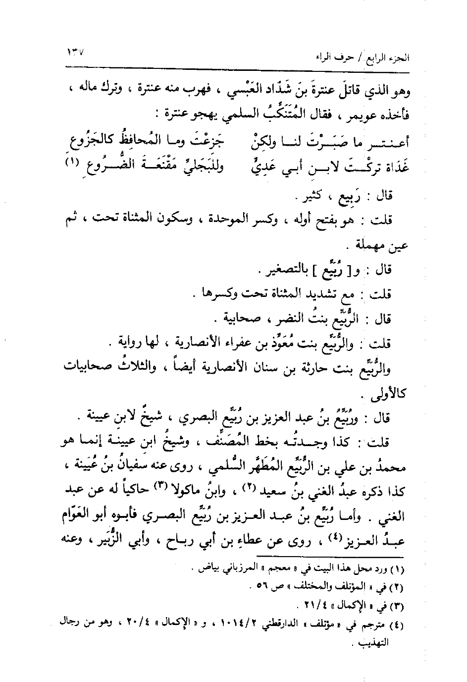قلت: كَذَا وجدته بِخَط المُصَنّف، وَشَيخ ابْن عُيَيْنَة إِنَّمَا هُوَ مُحَمَّد بن عَليّ بن الرّبيع المطهر السّلمِيّ، روى عَنهُ سُفْيَان بن عُيَيْنَة، كَذَا ذكره عبد الْغَنِيّ بن سعيد، وَابْن مَاكُولَا حاكياً لَهُ عَن عبد الْغَنِيّ. وَأما ربيع بن عبد الْعَزِيز بن ربيع الْبَصْرِيّ فأبوه أَبُو الْعَوام عبد الْعَزِيز، روى عَن عَطاء بن أبي رَبَاح، وَأبي الزبير، وَعنهُ