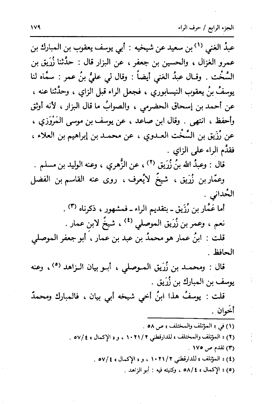 عبد الْغَنِيّ بن سعيد عَن شيخيه: أبي يُوسُف يَعْقُوب بن الْمُبَارك بن عَمْرو الغزال، وَالْحُسَيْن بن جَعْفَر، عَن الْبَزَّار قَالَ: حَدثنَا زُرَيْق بن السخت. وَقَالَ عبد الْغَنِيّ أَيْضا: وَقَالَ لي عَليّ بن عمر: سَمَّاهُ لنا يُوسُف بن يَعْقُوب النَّيْسَابُورِي، فَجعل الرَّاء قبل الزَّاي، وَحدثنَا عَنهُ، عَن أَحْمد بن إِسْحَاق الْحَضْرَمِيّ، وَالصَّوَاب مَا قَالَ الْبَزَّار، لِأَنَّهُ أوثق وأحفظ، انْتهى. وَقَالَ ابْن صاعد، عَن يُوسُف بن مُوسَى الْمروزِي، عَن رُزَيْق بن السخت الْعَدوي، عَن مُحَمَّد بن إِبْرَاهِيم بن الْعَلَاء، فَقدم الرَّاء على الزَّاي.