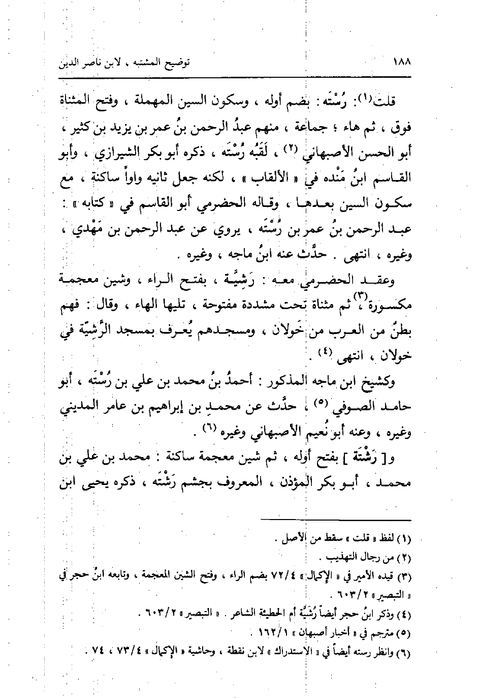 قلت: رُسْتَه: بِضَم أَوله، وَسُكُون السِّين الْمُهْملَة، وَفتح الْمُثَنَّاة فَوق، ثمَّ هَاء؛ جمَاعَة، مِنْهُم عبد الرَّحْمَن بن عمر بن يزِيد بن كثير، أَبُو الْحسن الْأَصْبَهَانِيّ، لقبه رسته، ذكره أَبُو بكر الشِّيرَازِيّ، وَأَبُو الْقَاسِم ابْن مَنْدَه فِي " الألقاب "، لكنه جعل ثَانِيه واواً سَاكِنة، مَعَ سُكُون السِّين بعْدهَا، وَقَالَهُ الْحَضْرَمِيّ أَبُو الْقَاسِم فِي " كِتَابه ": عبد الرَّحْمَن بن عمر بن رسته، يروي عَن عبد الرَّحْمَن بن مهْدي، وَغَيره، انْتهى. حدث عَنهُ ابْن مَاجَه، وَغَيره.