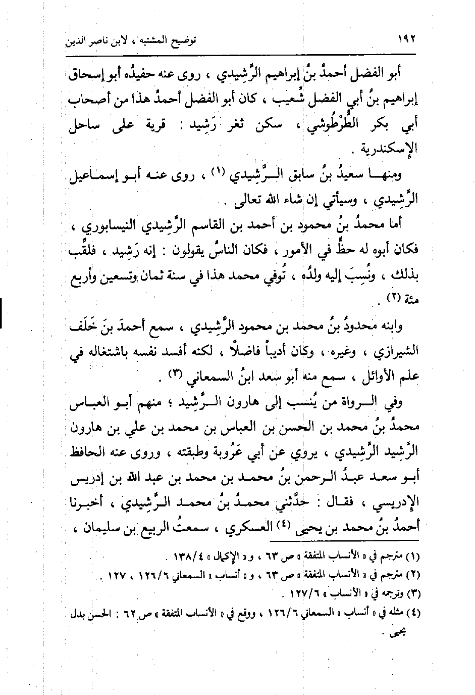 وَفِي الروَاة من ينْسب إِلَى هَارُون الرشيد؛ مِنْهُم أَبُو الْعَبَّاس مُحَمَّد بن مُحَمَّد بن الْحسن بن الْعَبَّاس بن مُحَمَّد بن عَليّ بن هَارُون الرشيد الرَّشِيدِيّ، يروي عَن أبي عرُوبَة وطبقته، وروى عَنهُ الْحَافِظ أَبُو سعد عبد الرَّحْمَن بن مُحَمَّد بن مُحَمَّد بن عبد الله بن إِدْرِيس الإدريسي، فَقَالَ: حَدثنِي مُحَمَّد بن مُحَمَّد الرَّشِيدِيّ، أخبرنَا أَحْمد بن مُحَمَّد بن يحيى العسكري، سَمِعت الرّبيع بن سُلَيْمَان،