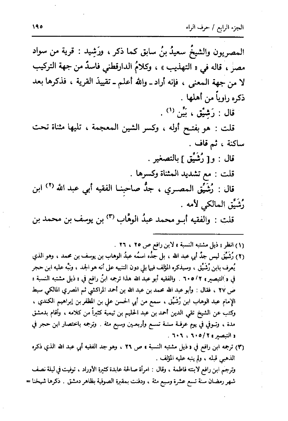 المصريون وَالشَّيْخ سعيد بن سَابق كَمَا ذكر، ورشيد: قَرْيَة من سَواد مصر، قَالَه فِي " التَّهْذِيب "، وَكَلَام الدَّارَقُطْنِيّ فاسدٌ من جِهَة التَّرْكِيب لَا من جِهَة الْمَعْنى، فَإِنَّهُ أَرَادَ _ وَالله أعلم _ تَقْيِيد الْقرْيَة، فَذكرهَا بعد ذكره رَاوِيا من أَهلهَا.