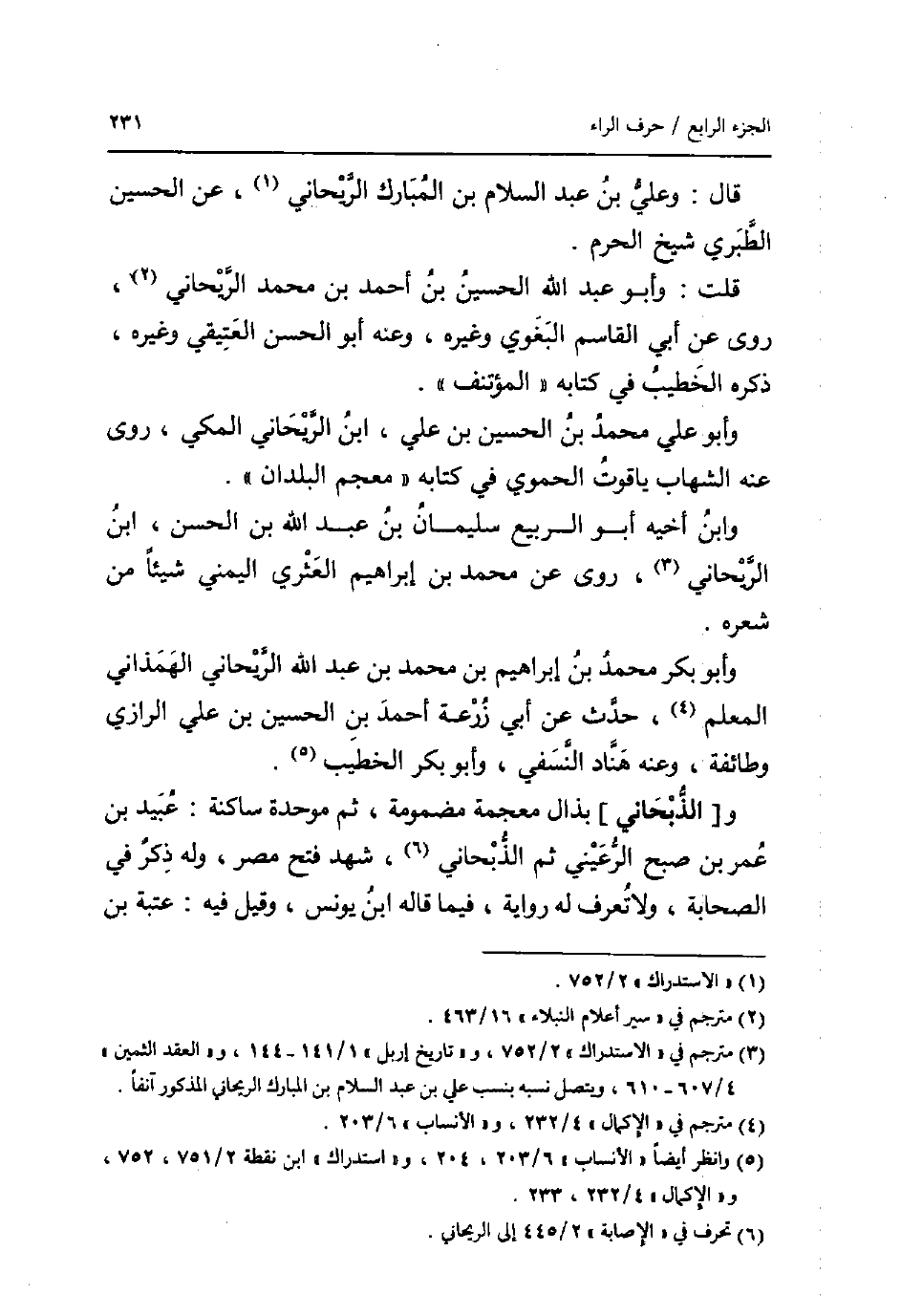 قلت: وَأَبُو عبد الله الْحُسَيْن بن أَحْمد بن مُحَمَّد الريحاني، روى عَن أبي الْقَاسِم الْبَغَوِيّ وَغَيره، وَعنهُ أَبُو الْحسن العتيقي وَغَيره، ذكره الْخَطِيب فِي كِتَابه " المؤتنف ".