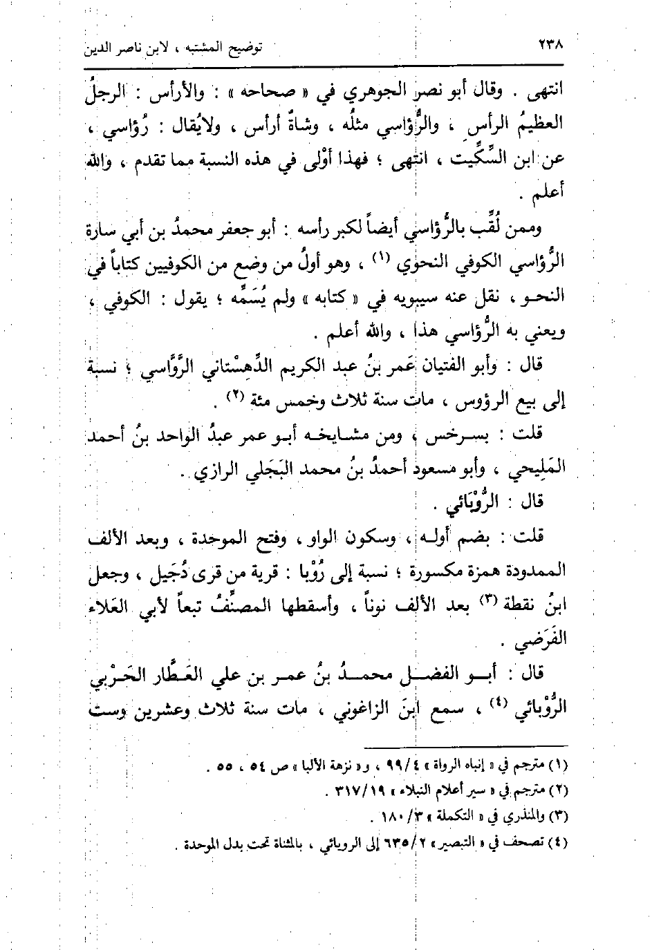 انْتهى، وَقَالَ أَبُو نصر الْجَوْهَرِي فِي " صحاحه ": والأرأس: الرجل الْعَظِيم الرَّأْس، والرؤاسي مثله، وشاةٌ أرأس، وَلَا يُقَال: رؤاسي، عَن ابْن السّكيت، انْتهى؛ فَهَذَا أولى فِي هَذِه النِّسْبَة مِمَّا تقدم، وَالله أعلم.