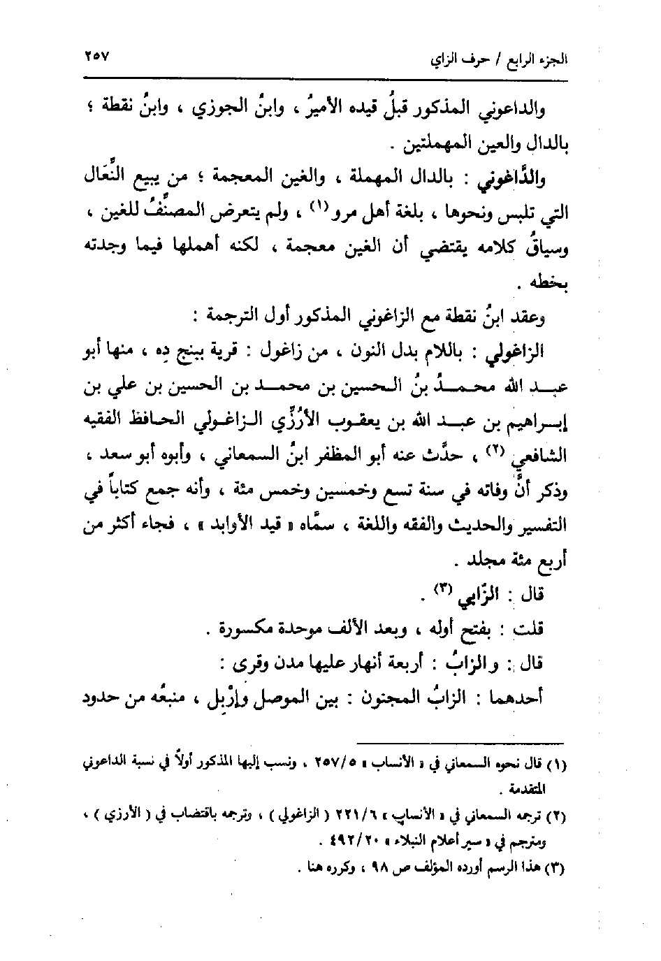 وَعقد ابْن نقطة مَعَ الزَّاغُونِيّ الْمَذْكُور أول التَّرْجَمَة: الزاغولي: بِاللَّامِ بدل النُّون، من زاغول: قَرْيَة ببنج ده، مِنْهَا أَبُو عبد الله مُحَمَّد بن الْحُسَيْن بن مُحَمَّد بن الْحُسَيْن بن عَليّ بن إِبْرَاهِيم بن عبد الله بن يَعْقُوب الأرزي الزاغولي الْحَافِظ الْفَقِيه الشَّافِعِي، حدث عَنهُ أَبُو المظفر ابْن السَّمْعَانِيّ، وَأَبوهُ أَبُو سعد، وَذكر أَن وَفَاته فِي سنة تسع وَخمسين وَخمْس مئة، وَأَنه جمع كتابا فِي التَّفْسِير والْحَدِيث وَالْفِقْه واللغة، سَمَّاهُ " قيد الأوابد "، فجَاء أَكثر من أَربع مئة مُجَلد.