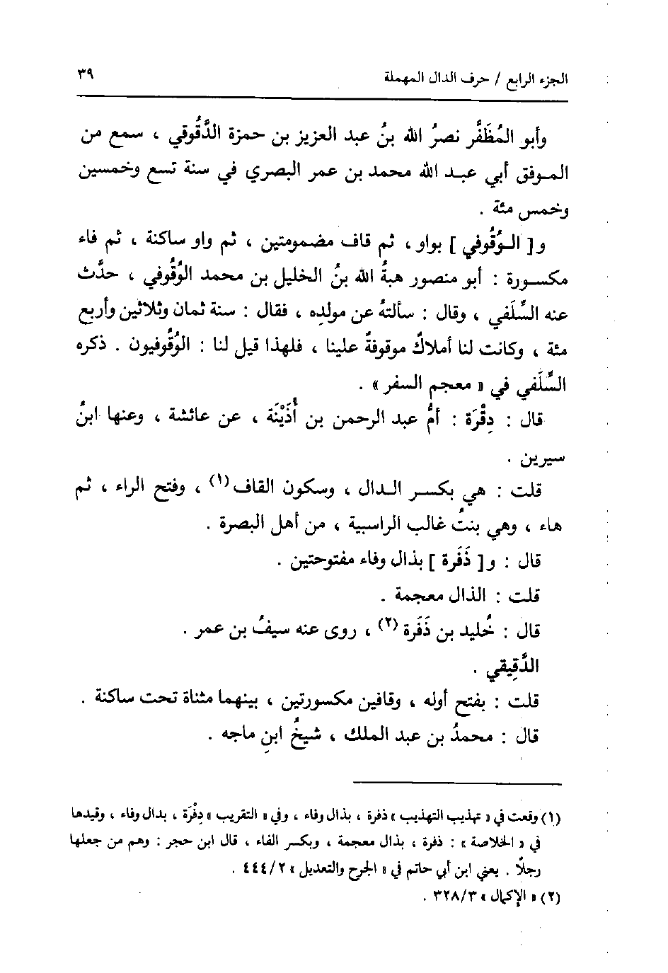 و [الوُقُوفي] بواو، ثمَّ قَاف مضمومتين، ثمَّ وَاو سَاكِنة، ثمَّ فَاء مَكْسُورَة: أَبُو مَنْصُور هبة الله بن الْخَلِيل بن مُحَمَّد الوقوفي، حدث عَنهُ السلَفِي، وَقَالَ: سَأَلته عَن مولده، فَقَالَ: سنة ثَمَان وَثَلَاثِينَ وَأَرْبع مئة، وَكَانَت لنا أَمْلَاك مَوْقُوفَة علينا، فَلهَذَا قيل لنا: الوقوفيون. ذكره السلَفِي فِي " مُعْجم السّفر ".