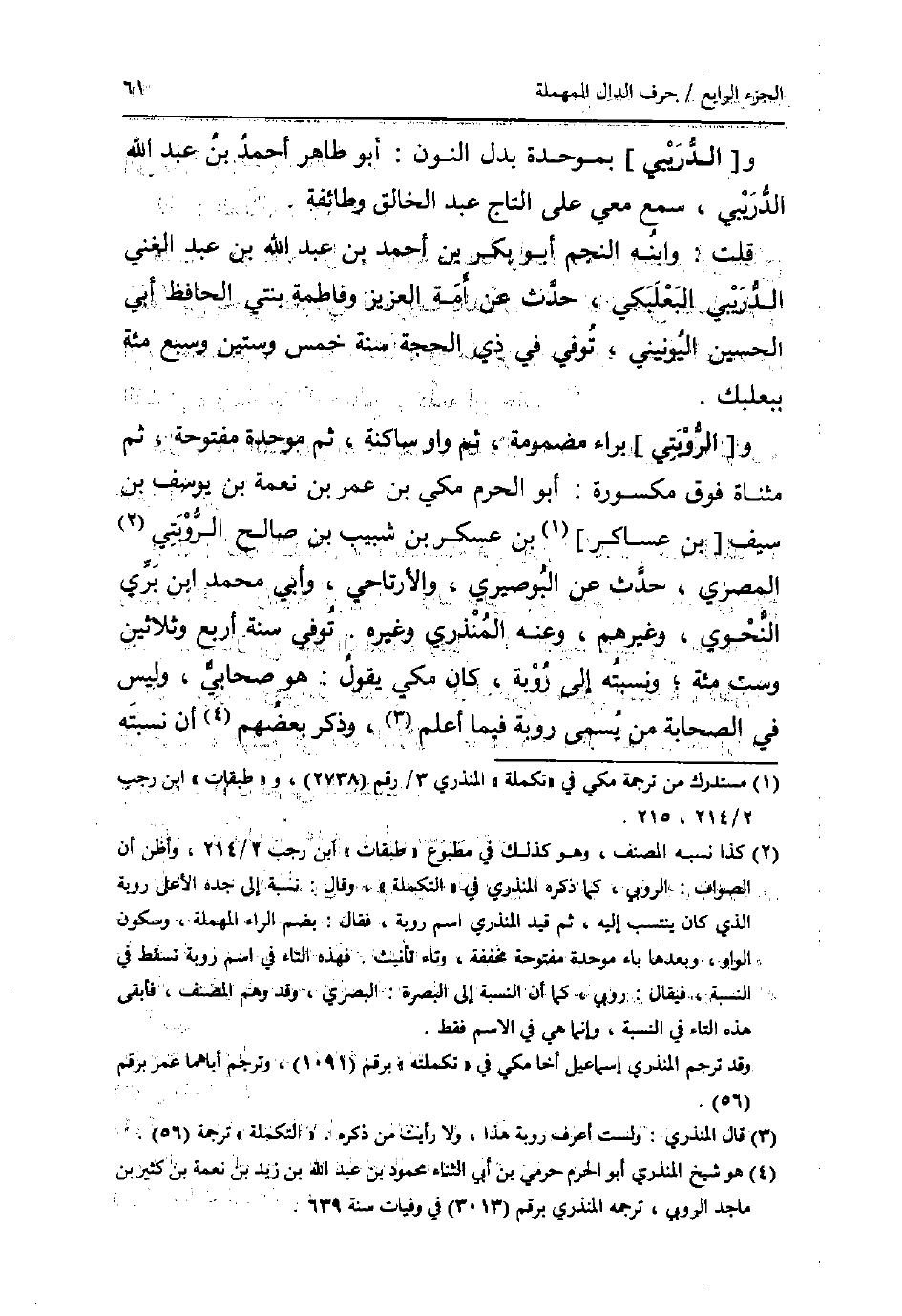 و [الرُّوْبَتِي] برَاء مَضْمُومَة، ثمَّ وَاو سَاكِنة، ثمَّ مُوَحدَة مَفْتُوحَة، ثمَّ مثناة فَوق مَكْسُورَة: أَبُو الْحرم مكي بن عمر بن نعْمَة بن يُوسُف بن سيف [بن عَسَاكِر] بن عَسْكَر بن شبيب بن صَالح الروبتي الْمصْرِيّ، حدث عَن البوصيري، والأرتاحي، وَأبي مُحَمَّد ابْن بري النَّحْوِيّ، وَغَيرهم، وَعنهُ الْمُنْذِرِيّ وَغَيره. توفّي سنة أَربع وَثَلَاثِينَ وست مئة؛ ونسبته إِلَى روبة، كَانَ مكي يَقُول: هُوَ صَحَابِيّ، وَلَيْسَ فِي الصَّحَابَة من يُسمى روبة فِيمَا أعلم، وَذكر بَعضهم أَن نسبته