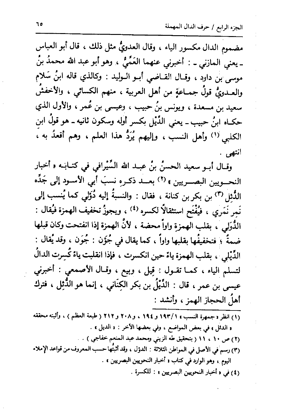 وَقَالَ أَبُو سعيد الْحسن بن عبد الله السيرافي فِي كِتَابه " أَخْبَار النَّحْوِيين الْبَصرِيين " بعد ذكره نسب أبي الْأسود إِلَى جده الدئل بن بكر بن كنَانَة، فَقَالَ: وَالنِّسْبَة إِلَيْهِ دؤلي كَمَا ينْسب إِلَى نمر نمري، فَيفتح استثقالاً لكسره، وَيجوز تَخْفيف الْهمزَة فَيُقَال: الدولي، بقلب الْهمزَة واواً مَحْضَة، لِأَن الْهمزَة إِذا انفتحت وَكَانَ قبلهَا ضمة؛ فتخفيفها بقلبها واواً، كَمَا يُقَال فِي جؤن: جون، وَقد يُقَال: الديلِي، بقلب الْهمزَة يَاء حِين انْكَسَرت، فَإِذا انقلبت ياءٌ كسرت الدَّال لتسلم الْيَاء، كَمَا تَقول: قيل، ربيع، وَقَالَ الْأَصْمَعِي: أَخْبرنِي عِيسَى بن عمر، قَالَ: الديل بن بكر الْكِنَانِي، إِنَّمَا هُوَ الدئل، فَترك أهل الْحجاز الْهَمْز، وَأنْشد: