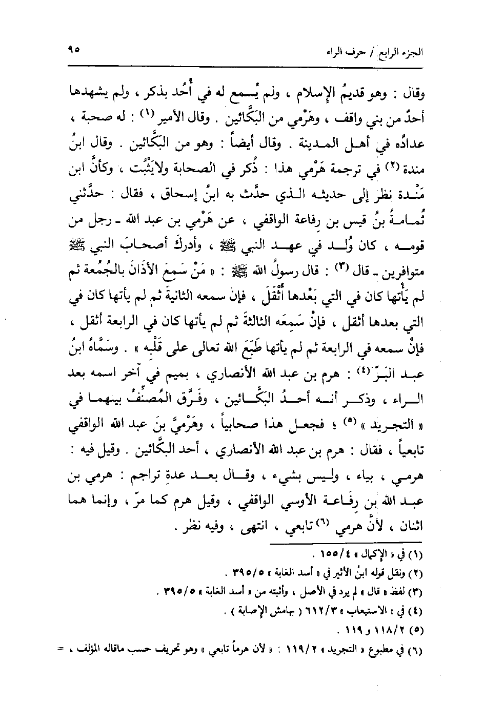 وَقَالَ: وَهُوَ قديم الْإِسْلَام، وَلم يسمع لَهُ فِي أحد بِذكر، وَلم يشهدها أحد من بني وَاقِف، وهرمي من البكائين. وَقَالَ الْأَمِير: لَهُ صُحْبَة، عداده فِي أهل الْمَدِينَة. وَقَالَ أَيْضا: وَهُوَ من البكائين. وَقَالَ ابْن مندة فِي تَرْجَمَة هرمي هَذَا: ذكر فِي الصَّحَابَة وَلَا يثبت، وَكَأن ابْن مندة نظر إِلَى حَدِيثه الَّذِي حدث بِهِ ابْن إِسْحَاق، فَقَالَ: حَدثنِي ثُمَامَة بن قيس بن رِفَاعَة الوَاقِفِي، عَن هرمي بن عبد الله _ رجل من قومه، كَانَ ولد فِي عهد النَّبِي صلى الله عَلَيْهِ وَسلم، وَأدْركَ أَصْحَاب النَّبِي صلى الله عَلَيْهِ وَسلم متوافرين _ قَالَ: قَالَ رَسُول الله صلى الله عَلَيْهِ وَسلم: " من سمع الْأَذَان بِالْجمعَةِ ثمَّ لم يأتها كَانَ فِي الَّتِي بعْدهَا أثقل، فَإِن سَمعه الثَّانِيَة ثمَّ لم يأتها كَانَ فِي الَّتِي بعْدهَا أثقل، فَإِن سَمعه الثَّالِثَة ثمَّ لم يأتها كَانَ فِي الرَّابِعَة أثقل، فَإِن سَمعه فِي الرَّابِعَة ثمَّ لم يأتها طبع الله تَعَالَى على قلبه ". وَسَماهُ ابْن عبد الْبر: هرم بن عبد الله الْأنْصَارِيّ، بميم فِي آخر اسْمه بعد الرَّاء، وَذكر أَنه أحد البكائين، وَفرق المُصَنّف بَينهمَا فِي " التَّجْرِيد "؛ فَجعل هَذَا صحابياً، وهرمي بن عبد الله الوَاقِفِي تابعياً، فَقَالَ: هرم بن عبد الله الْأنْصَارِيّ، أحد البكائين. وَقيل فِيهِ: هرمي، بياء، وَلَيْسَ بِشَيْء، وَقَالَ بعد عدَّة تراجم: هرمي بن عبد الله بن رِفَاعَة الأوسي الوَاقِفِي، وَقيل هرم كَمَا مر، وَإِنَّمَا هما اثْنَان، لِأَن هرمي تَابِعِيّ، انْتهى، وَفِيه نظر.