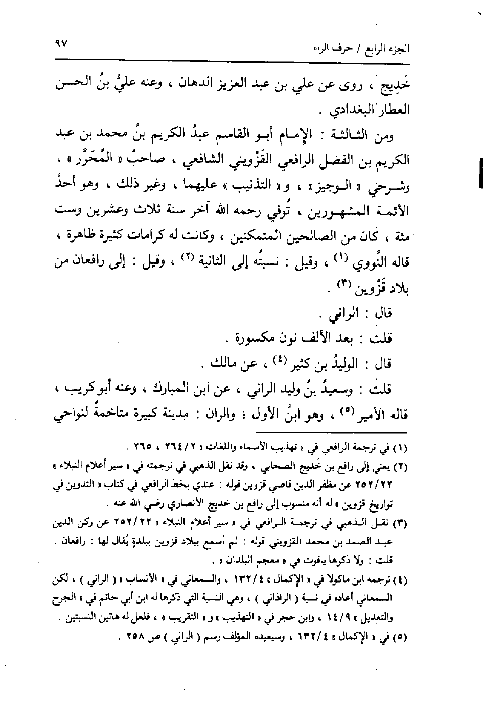 وَمن الثَّالِثَة: الإِمَام أَبُو الْقَاسِم عبد الْكَرِيم بن مُحَمَّد بن عبد الْكَرِيم بن الْفضل الرَّافِعِيّ الْقزْوِينِي الشَّافِعِي، صَاحب " الْمُحَرر "، وشرحي " الْوَجِيز "، و " التذنيب " عَلَيْهِمَا، وَغير ذَلِك، وَهُوَ أحد الْأَئِمَّة الْمَشْهُورين، توفّي رَحمَه الله آخر سنة ثَلَاث وَعشْرين وست مئة، كَانَ من الصَّالِحين المتمكنين، وَكَانَت لَهُ كرامات كَثِيرَة ظَاهِرَة، قَالَه النَّوَوِيّ، وَقيل: نسبته إِلَى الثَّانِيَة، وَقيل: إِلَى رافعان من بِلَاد قزوين.