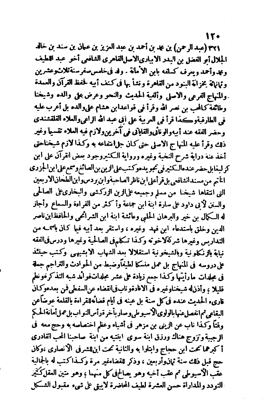 321 - عبد الرَّحْمَن بن مُحَمَّد بن أَحْمد بن عبد الْعَزِيز بن عُثْمَان بن سَنَد بن خَالِد الْجلَال أَبُو الْفضل بن الْبَدْر الأبياري الأَصْل القاهري الشَّافِعِي أَخُو عبد اللَّطِيف وَمُحَمّد وَأحمد وَيعرف كسلفه بِابْن الْأَمَانَة. / ولد فِي خَامِس صفر سنة ثَلَاث وَعشْرين وَثَمَانمِائَة بخزانة البنود من الْقَاهِرَة وَنَشَأ بهَا فِي كنف أَبِيه فحفظ الْقُرْآن والعمدة والمنهاج الفرعي والأصلي وألفية الحَدِيث والنحو وَعرض على وَالِده وَشَيخنَا وَطَائِفَة كالمحب بن نصر الله وَقَرَأَ فِي قَوَاعِد ابْن هِشَام على وَالِده بل أعرب عَلَيْهِ فِي الطارقية وَكَذَا قَرَأَ فِي الْعَرَبيَّة على أبي عبد الله الرَّاعِي والْعَلَاء القلقشندي وَحضر الْفِقْه عِنْد أَبِيه والونائي والقاياتي فِي آخَرين ولازم فِيهِ الْعَلَاء تقسيما وَغير ذَلِك وَقَرَأَ عَلَيْهِ الْمِنْهَاج الْأَصْلِيّ حَتَّى كَانَ جلّ انتفاعه بِهِ وَكَذَا لَازم شَيخنَا حَتَّى أَخذ عَنهُ دراية شرح)