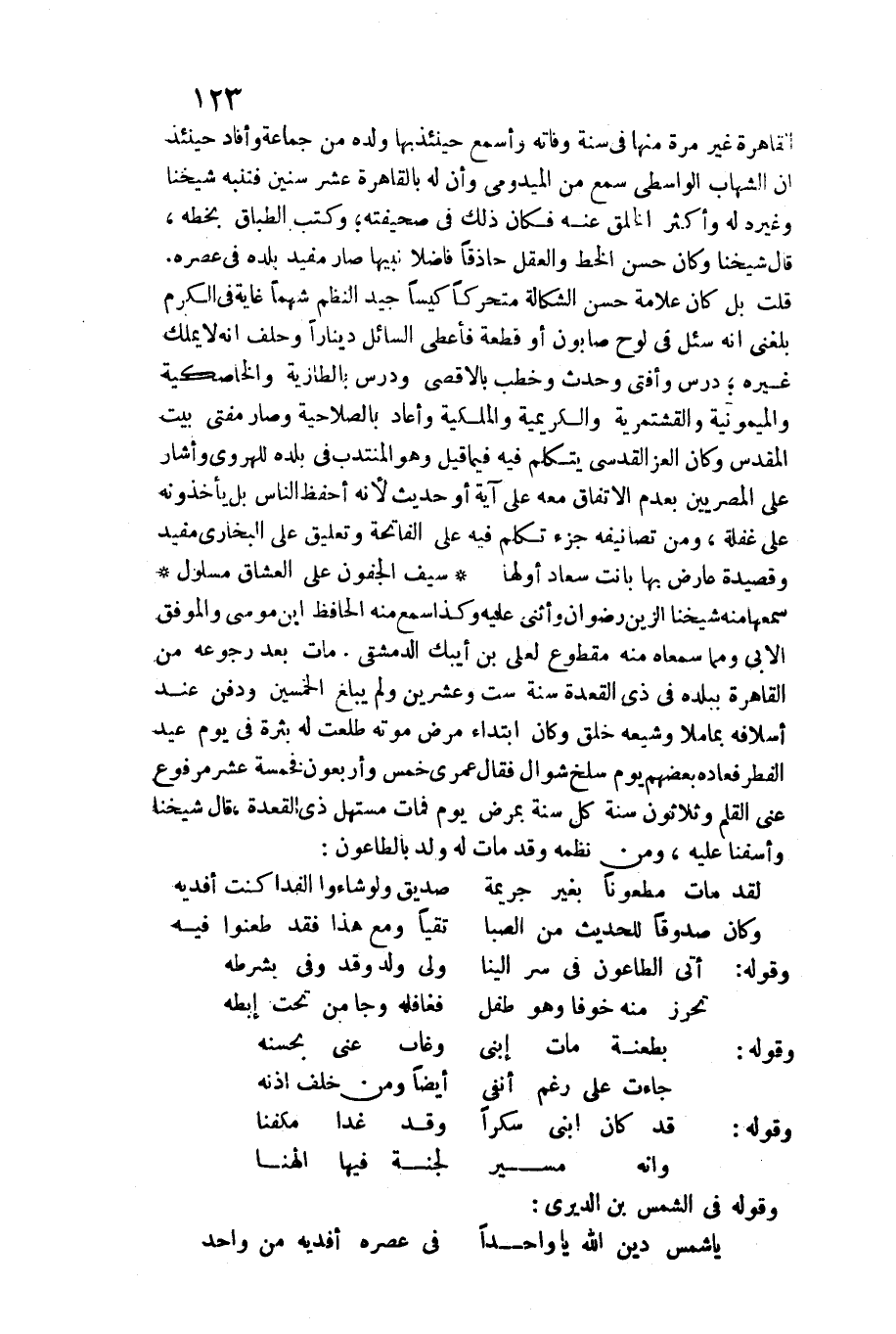 وَحلف أَنه لَا يملك غَيره درس وَأفْتى وَحدث وخطب بالاقصى ودرس بالطازية والخاصكية والميمونية والقشتمرية والكريمية والملكية وَأعَاد بالصلاحية وَصَارَ مفتي بَيت الْمُقَدّس وَكَانَ الْعِزّ الْقُدسِي يتَكَلَّم فِيهِ فِيمَا قيل وَهُوَ المنتدب فِي بَلَده للهروي وَأَشَارَ على المصريين بِعَدَمِ الِاتِّفَاق مَعَه على آيَة أَو حَدِيث لِأَنَّهُ أحفظ النَّاس بل يأخذونه على غَفلَة، وَمن تصانيفه جُزْء تكلم فِيهِ على الْفَاتِحَة وَتَعْلِيق على البُخَارِيّ مُفِيد وقصيدة عَارض بهَا بَانَتْ سعاد أَولهَا سيف الجفون على العشاق مسلول سَمعهَا مِنْهُ شَيخنَا الزين رضوَان وَأثْنى عَلَيْهِ وَكَذَا سمع مِنْهُ الْحَافِظ ابْن مُوسَى والموفق الأبي وَمِمَّا سمعاه مِنْهُ مَقْطُوع لعَلي بن أيبك الدِّمَشْقِي. مَاتَ بعد رُجُوعه من الْقَاهِرَة بِبَلَدِهِ فِي ذِي الْقعدَة سنة سِتّ وَعشْرين وَلم يبلغ الْخمسين وَدفن عِنْد أسلافه بماملا وشيعه خلق وَكَانَ ابْتِدَاء مرض مَوته طلعت لَهُ بثرة فِي يَوْم عيد الْفطر فعاده بَعضهم يَوْم سلخ شَوَّال فَقَالَ عمري خمس وَأَرْبَعُونَ فخمسة عشر مَرْفُوع عني الْقَلَم وَثَلَاثُونَ سنة كل سنة بِمَرَض يَوْم فَمَاتَ مستهل ذِي الْقعدَة، قَالَ شَيخنَا وأسفنا عَلَيْهِ، وَمن نظمه وَقد مَاتَ لَهُ ولد بالطاعون: