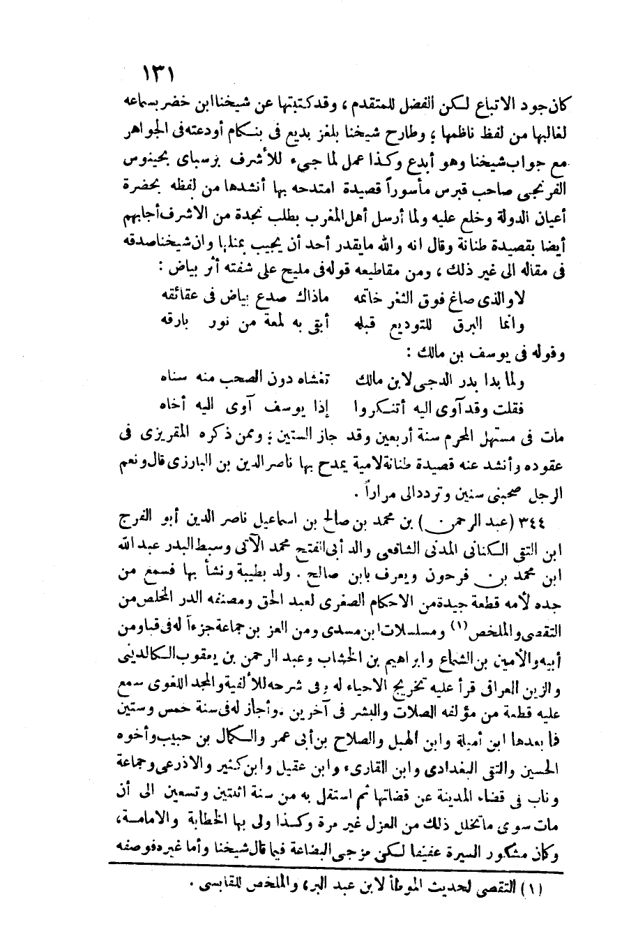 كَانَ جود الِاتِّبَاع لَكِن الْفضل للمتقدم، وَقد كتبتها عَن شَيخنَا ابْن خضر بِسَمَاعِهِ لغالبها من لفظ ناظمها وطارح شَيخنَا بلغز بديع فِي بنكام أودعته فِي الْجَوَاهِر مَعَ جَوَاب شَيخنَا وَهُوَ أبدع وَكَذَا عمل لما جِيءَ للأشرف برسباي بحينوس الفرنجي صَاحب قبرس مأسورا قصيدة امتدحه بهَا أنشدها من لَفظه بِحَضْرَة أَعْيَان الدولة وخلع عَلَيْهِ وَلما أرسل أهل الْمغرب بطلبة نجدة من الْأَشْرَف أجابهم أَيْضا بقصيدة طنانة وَقَالَ إِنَّه وَالله مَا يقدر أحد أَن يُجيب بِمِثْلِهَا وَإِن شَيخنَا صدقه فِي مقاله إِلَى غير ذَلِك، وَمن مقاطيعه قَوْله فِي مليح على شفته أثر بَيَاض: