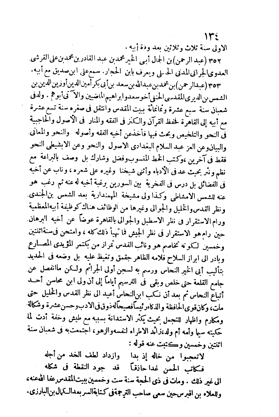 352 - عبد الرَّحْمَن بن الْجمال أبي الْخَيْر مُحَمَّد بن عبد الْقَادِر بن مُحَمَّد بن عَليّ الْقرشِي الْعَدوي الجراني الْمدنِي الْحَنْبَلِيّ وَيعرف بِابْن الحجار. سمع على ابْن صديق مَعَ أَبِيه. عبد الرَّحْمَن بن مُحَمَّد بن عبد الله بن سعد بن أبي بكر أَمِين الدّين أوزين الدّين بن الشَّمْس بن الديري الْمَقْدِسِي الْحَنَفِيّ أَخُو سعد وَإِبْرَاهِيم الماضيين والآتي أبوهم. ولد فِي شعْبَان سنة سبع عشرَة وَثَمَانمِائَة بِبَيْت الْمُقَدّس وانتقل فِي صغره سنة تسع عشرَة مَعَ أَبِيه إِلَى الْقَاهِرَة فحفظ الْقُرْآن والكنز فِي الْفِقْه والمنار فِي الْأُصُول والحاجبية فِي النَّحْو وَالتَّلْخِيص وَبحث فِيهَا فَأخذ عَن أَخِيه الْفِقْه وأصوله والنحو والمعاني وَالْبَيَان وَعَن الْعِزّ عبد السَّلَام الْبَغْدَادِيّ الاصول والنحو وَعَن الابشيطي النَّحْو فَقَط فِي آخَرين، وَكتب الْخط الْمَنْسُوب وَفضل وشارك بل وصف بالبراعة مَعَ نظم ونثر بِحَيْثُ عد فِي الأدباء وَأثْنى شَيخنَا وَغَيره على شعره، وناب عَن أَخِيه فِي الْفَضَائِل بل درس فِي الفخرية بَين السورين برغبة أَخِيه لَهُ عَنهُ ثمَّ رغب هُوَ عَنهُ للشمس الامشاطي وَكَذَا ولي مشيخة المهمندارية بعد الشَّمْس بن الجندي وَنظر الْقُدس والخليل والجوالي وَغَيرهَا من الْوَظَائِف هُنَاكَ كوظيفة أَبِيه المعظمية ورام الِاسْتِقْرَار فِي نظر الاسطبل والجوالي بِالْقَاهِرَةِ عوضا عَن أَخِيه الْبُرْهَان حِين رام هُوَ الِاسْتِقْرَار فِي نظر الْجَيْش فَمَا تهَيَّأ ذَلِك كُله، وامتحن فِي سنة اثْنَتَيْنِ وَخمسين لكَونه تخاصم هُوَ ونائب الْقُدس تمراز من بكتمر المؤيدي المصارع وبادر إِلَى إبراز السِّلَاح فلامه الظَّاهِر جقمق وتغيظ عَلَيْهِ بل وَضعه فِي الْحَدِيد بتأليب أبي الْخَيْر النّحاس ورسم بِهِ لسجن أولي الجرائم وَلَكِن مَا انْفَصل عَن جَامع القلعة حَتَّى خلص وَبَقِي فِي الترسيم أَيَّامًا إِلَى أَن ولي ابْن محَاسِن أحد أَتبَاع النّحاس ثمَّ بعد أَن نكب ابْن النّحاس أُعِيد إِلَى نظر الْقُدس والخليل حَتَّى مَاتَ، وَكَانَ قوي الحافظة والذكاء رَئِيسا فصيحا لَهُ ذوق فِي الْأَدَب وَحسن عشرَة وشكالة وَمَكَارِم وَإِظْهَار للتجمل بِحَيْثُ يكثر الِاسْتِدَانَة)