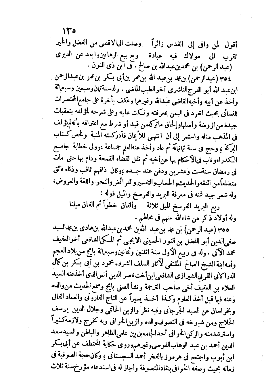 354 - عبد الرَّحْمَن بن مُحَمَّد بن عبد الله بن عمر بن أبي بكر بن عمر بن عبد الرَّحْمَن ابْن عبد الله أَبُو الْفرج النَّاشِرِيّ أَخُو الطّيب / الْمَاضِي. ولد سنة ثَمَان وَسبعين وَسَبْعمائة وَأخذ عَن أَبِيه وأخيه القَاضِي عبد الله وَغَيرهمَا وَعَكَفَ بِأخرَة على جَامع المختصرات للنسائي بِحَيْثُ انْفَرد فِي الْيمن بمعرفته ونكت عَلَيْهِ وعَلى شَرحه لمؤلفه بتعقبات جَيِّدَة من الرَّوْضَة وَأَصلهَا إِلْحَاق مَا تَركه من قيد أَو شَرط مَعَ اعترافه بِأَنَّهُ لم يؤلف فِي الْمَذْهَب مثله وَاسْتمرّ إِلَى أَن انْتهى للأيمان فَأَدْرَكته الْمنية ولخص كتاب الْبركَة وَحج فِي سنة ثَمَانمِائَة ثمَّ عَاد وَأخذ عَنهُ الْعلم جمَاعَة، وَولي خطابة جَامع الكدراء وناب فِي الْأَحْكَام بهَا عَن أَخِيه ثمَّ نقل لقَضَاء القمحة ودام بهَا حَتَّى مَاتَ فِي رَمَضَان سنة سِتّ وَعشْرين وَدفن عِنْد جده وَكَانَ ذَا فهم ثاقب وذكاء فائق متضلعا من الْفِقْه والْحَدِيث والحساب وَالتَّفْسِير والفرائض والنحو واللغة وَالْعرُوض، وَله شعر جيد فَمِنْهُ فِي معرفَة الْبَرِيد والفرسخ والميل قَوْله:
