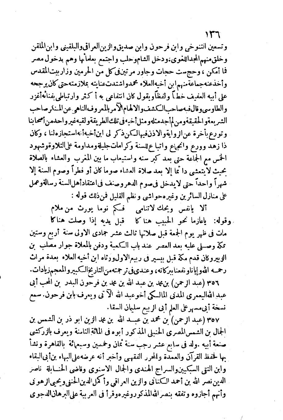 356 - عبد الرَّحْمَن بن مُحَمَّد بن عبد الله بن مُحَمَّد بن فَرِحُونَ الْبَدْر بن الْمُحب أبي عبد الله الْيَعْمرِي الْمدنِي الْمَالِكِي أَخُو عبد الله / الْآتِي وَيعرف بِابْن فَرِحُونَ. سمع نُسْخَة أبي مسْهر على الْعلم أبي الرّبيع سُلَيْمَان السقا.