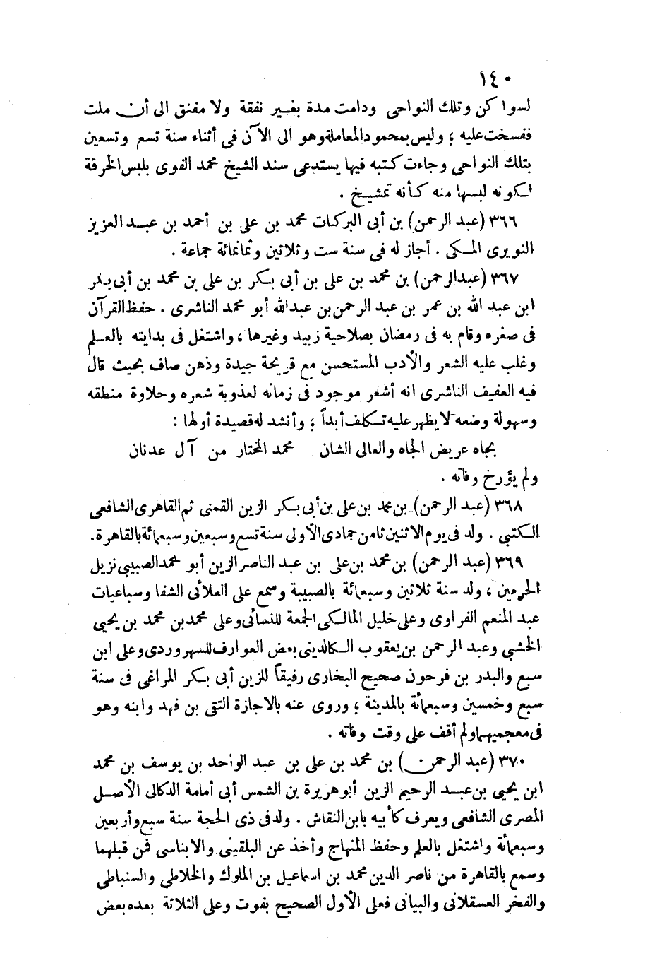369 - عبد الرَّحْمَن بن مُحَمَّد بن عَليّ بن عبد النَّاصِر الزين أَبُو مُحَمَّد الصبيبي نزيل الْحَرَمَيْنِ /، ولد سنة ثَلَاثِينَ وَسَبْعمائة بالصبيبة وَسمع على العلائي الشفا وسباعيات عبد الْمُنعم الفراوي وعَلى خَلِيل الْمَالِكِي الْجُمُعَة للنسائي وعَلى مُحَمَّد بن مُحَمَّد بن يحيى الخشبي وَعبد الرَّحْمَن بن يَعْقُوب الكالديني بعض العوارف للسهروردي وعَلى ابْن سبع والبدر بن فَرِحُونَ صَحِيح البُخَارِيّ رَفِيقًا للزين أبي بكر المراغي فِي سنة سبع وَخمسين وَسَبْعمائة بِالْمَدِينَةِ وروى عَنهُ بالاجازة التقي بن فَهد وَابْنه وَهُوَ فِي معجميهما وَلم أَقف على وَقت وَفَاته