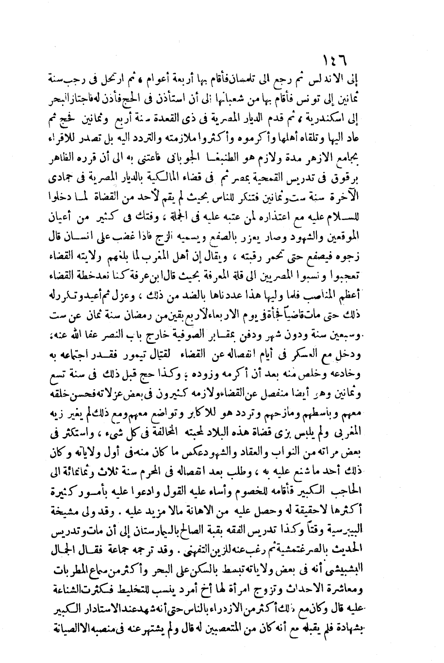 فَأَقَامَ بهَا من شعبانها إِلَى أَن اسْتَأْذن فِي الْحَج فَأذن لَهُ فاجتاز الْبَحْر إِلَى اسكندرية، ثمَّ قدم الديار المصرية فِي ذِي الْقعدَة سنة أَربع وَثَمَانِينَ فحج ثمَّ عَاد إِلَيْهَا وتلقاه أَهلهَا وأكرموه وَأَكْثرُوا ملازمته والتردد إِلَيْهِ بل تصدر للاقراء بِجَامِع الْأَزْهَر مُدَّة ولازم الطنبغا الجوباني فاعتنى بِهِ إِلَى أَن قَرَّرَهُ الظَّاهِر برقوق فِي تدريس القمحية بِمصْر ثمَّ قَضَاء الْمَالِكِيَّة بالديار المصرية فِي جُمَادَى الْآخِرَة سنة سِتّ وَثَمَانِينَ فتنكر للنَّاس بِحَيْثُ لم يقم لأحد من الْقُضَاة لما دخلُوا للسلام عَلَيْهِ مَعَ اعتذاره لمن عَتبه عَلَيْهِ فِي الْجُمْلَة، وفتك فِي كثير من أَعْيَان الموقعين وَالشُّهُود وَصَارَ يُعَزّر بالصفع ويسميه الزج فَإِذا غضب على إِنْسَان قَالَ زجوه فيصفع حَتَّى تحمر رقبته، وَيُقَال إِن أهل الْمغرب لما بَلغهُمْ ولَايَته الْقَضَاء تعجبوا ونسبوا إِلَى المصريين إِلَى قلَّة الْمعرفَة بِحَيْثُ قَالَ ابْن عَرَفَة كُنَّا نعد خطة الْقَضَاء أعظم المناصب فَلَمَّا وَليهَا هَذَا عددناها بالضد من ذَلِك، وعزل ثمَّ أُعِيد وتكرر لَهُ ذَلِك حَتَّى مَاتَ قَاضِيا فَجْأَة فِي يَوْم الْأَرْبَعَاء لأَرْبَع بَقينَ من رَمَضَان سنة ثمن عَن سِتّ وَسبعين سنة وَدون شهر وَدفن بمقابر الصُّوفِيَّة خَارج بَاب النَّصْر عَفا الله عَنهُ، وَدخل مَعَ الْعَسْكَر فِي أَيَّام انْفِصَاله عَن الْقَضَاء لقِتَال تيمور فَقدر اجتماعه بِهِ وخادعه وخلص مِنْهُ بعد أَن أكْرمه وزوده وَكَذَا حج قبل ذَلِك فِي سنة تسع وَثَمَانِينَ وَهُوَ أَيْضا مُنْفَصِل عَن الْقَضَاء ولازمه كَثِيرُونَ فِي بعض عزلاته فَحسن خلقه مَعَهم وباسطهم ومازحهم وَتردد هُوَ للأكابر وتواضع مَعَهم وَمَعَ ذَلِك لم يُغير زيه المغربي وَلم يلبس بزِي قُضَاة هَذِه الْبِلَاد لمحبته الْمُخَالفَة فِي كل شَيْء، واستكثر فِي بعض مراته من النواب والعقاد وَالشُّهُود عكس مَا كَانَ مِنْهُ فِي أول ولاياته وَكَانَ ذَلِك أحد مَا شنع عَلَيْهِ بِهِ، وَطلب بعد انْفِصَاله فِي الْمحرم سنة ثَلَاث وَثَمَانمِائَة إِلَى الْحَاجِب الْكَبِير فأقامه للخصوم وأساء عَلَيْهِ القَوْل وَادعوا عَلَيْهِ بِأُمُور كَثِيرَة أَكْثَرهَا لَا حَقِيقَة لَهُ وَحصل عَلَيْهِ من الاهانة مَا لَا مزِيد عَلَيْهِ. وَقد ولي مشيخة البيبرسية وقتا وَكَذَا تدريس الْفِقْه بقبة الصَّالح بالبيمارستان إِلَى أَن مَاتَ وتدريس الحَدِيث بالصرغتمشية ثمَّ رغب عَنهُ للزين التفهني. وَقد تَرْجمهُ جمَاعَة فَقَالَ الْجمال البشبيشي أَنه فِي بعض ولاياته تبسط بالسكن على الْبَحْر وَأكْثر من سَماع المطربات ومعاشرة الْأَحْدَاث وَتزَوج امْرَأَة لَهَا أَخ أَمْرَد ينْسب للتخليط فكثرت الشناعة عَلَيْهِ قَالَ وَكَانَ مَعَ ذَلِك أَكثر من الازدراء بِالنَّاسِ حَتَّى أَنه شهد عِنْد الاستادار الْكَبِير بِشَهَادَة فَلم يقبله مَعَ أَنه كَانَ من المتعصبين لَهُ قَالَ وَلم يشْتَهر عَنهُ فِي منصبه إِلَّا الصيانة