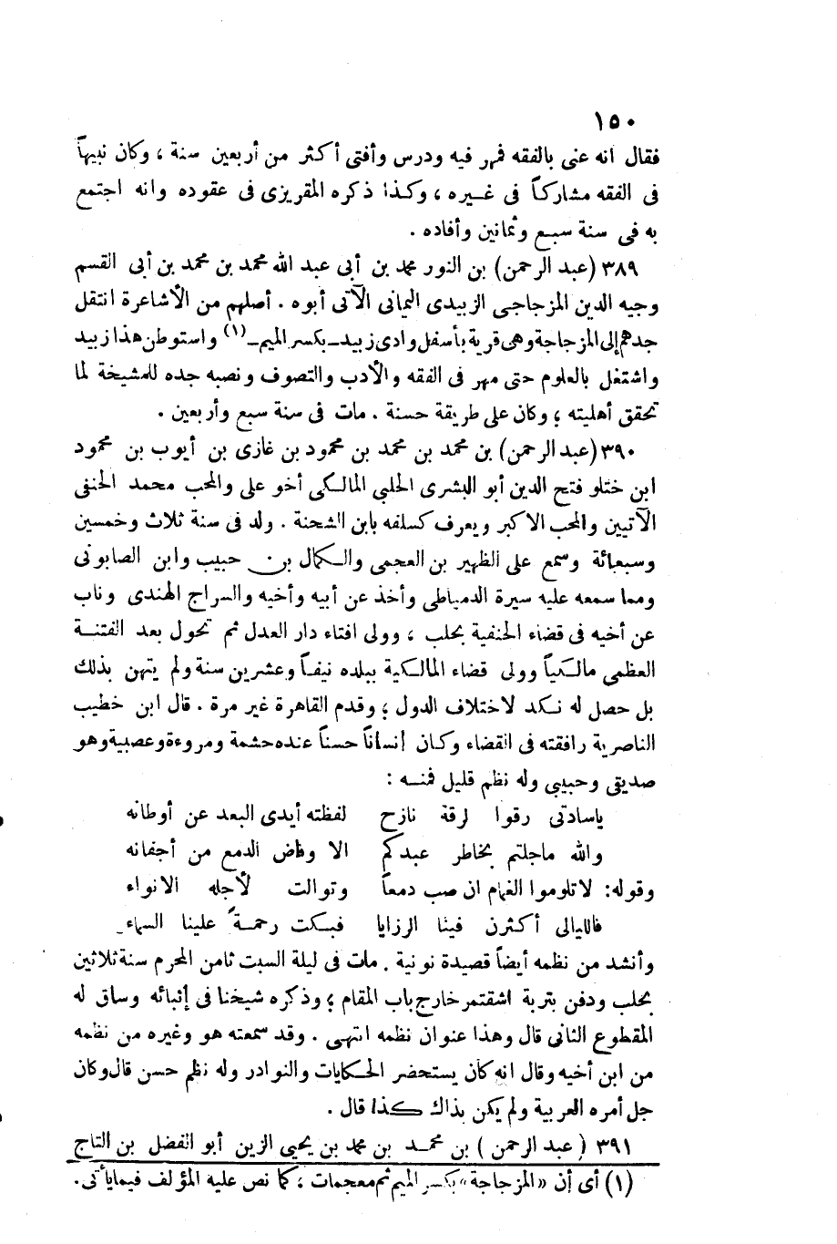 389 - عبد الرَّحْمَن بن النُّور مُحَمَّد بن أبي عبد الله مُحَمَّد بن مُحَمَّد بن أبي الْقسم وجيه الدّين المزجاجي الزبيدِيّ الْيَمَانِيّ / الْآتِي أَبوهُ. أصلهم من الأشاعرة انْتقل جدهم إِلَى المزجاجة وَهِي قَرْيَة بِأَسْفَل وَادي زبيد بِكَسْر الْمِيم واستوطن هَذَا زبيد واشتغل بالعلوم حَتَّى مهر فِي الْفِقْه وَالْأَدب والتصوف ونصبه جده للمشيخة لما تحقق أَهْلِيَّته وَكَانَ على طَريقَة حَسَنَة. مَاتَ فِي سنة سبع وَأَرْبَعين.