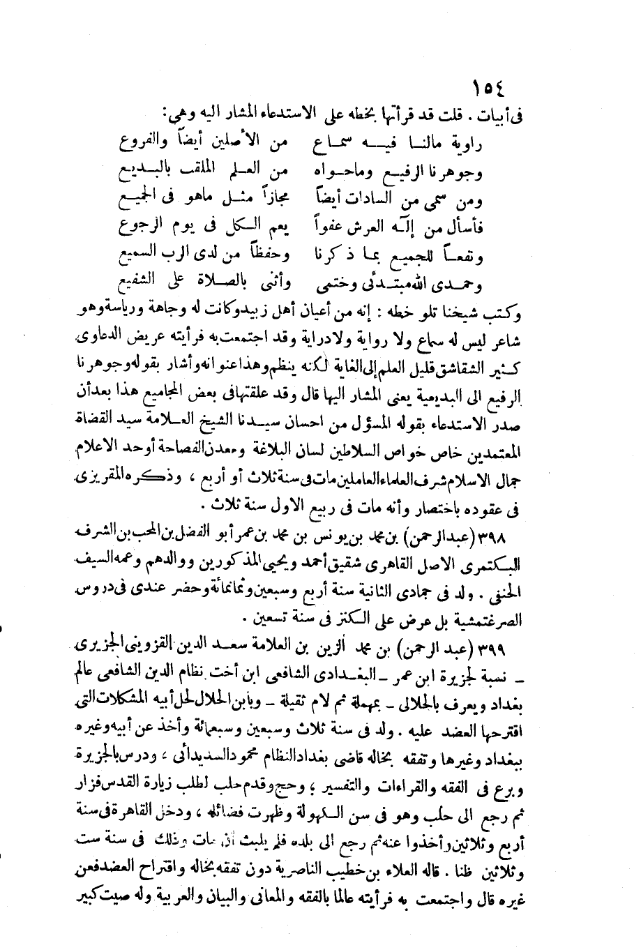 399 - عبد الرَّحْمَن بن مُحَمَّد الزين بن الْعَلامَة سعد الدّين الْقزْوِينِي الجزيري نِسْبَة لجزيرة ابْن عمر الْبَغْدَادِيّ الشَّافِعِي ابْن أُخْت نظام الدّين الشَّافِعِي / عَالم بَغْدَاد وَيعرف بالحلالي بِمُهْملَة ثمَّ لَام ثَقيلَة وبابن الْحَلَال لحل أَبِيه المشكلات الَّتِي اقترحها الْعَضُد عَلَيْهِ. ولد فِي سنة ثَلَاث وَسبعين وَسَبْعمائة وَأخذ عَن أَبِيه وَغَيره بِبَغْدَاد وَغَيرهَا وتفقه بخاله قَاضِي بَغْدَاد النظام مَحْمُود السديدائي، ودرس بالجزيرة وبرع فِي الْفِقْه والقراءات وَالتَّفْسِير وَحج وَقدم حلب لطلب زِيَارَة الْقُدس فزار ثمَّ رَجَعَ إِلَى حلب وَهُوَ فِي سنّ الكهولة وَظَهَرت فضائله، وَدخل الْقَاهِرَة فِي سنة أَربع وَثَلَاثِينَ وَأخذُوا عَنهُ ثمَّ رَجَعَ إِلَى بَلَده فَلم يلبث أَن مَاتَ وَذَلِكَ فِي سنة سِتّ وَثَلَاثِينَ ظنا.
