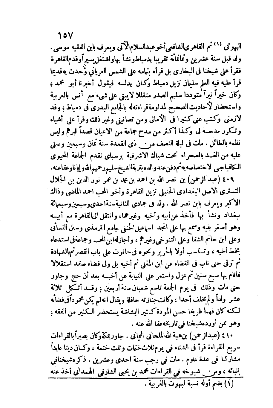 409 - عبد الرَّحْمَن بن نصر الله بن أَحْمد بن مُحَمَّد بن عمر نور الدّين بن الْجلَال التسترِي الأَصْل الْبَغْدَادِيّ الْحَنْبَلِيّ نزيل الْقَاهِرَة وأخو الْمُحب أَحْمد / الْمَاضِي وَذَاكَ الْأَكْبَر وَيعرف بِابْن نصر الله. ولد فِي جُمَادَى الثَّانِيَة سنة إِحْدَى وَسبعين وَسَبْعمائة بِبَغْدَاد وَنَشَأ بهَا فَأخذ عَن أَبِيه وأخيه وَغَيرهمَا، وانتقل إِلَى الْقَاهِرَة مَعَ أَبِيه وَهُوَ أَصْغَر بنيه وَسمع بهَا على الْمجد إِسْمَاعِيل الْحَنَفِيّ جَامع التِّرْمِذِيّ وَسنَن النَّسَائِيّ وعَلى ابْن حَاتِم الشفا وعَلى التنوخي وَغَيرهم، وَأَجَازَ لَهُ ابْن الْمُحب وَجَمَاعَة فِي استدعاء بِخَط أَخِيه، وتكسب أَولا بالحرير وَنَحْوه فِي حَانُوت على بَاب الْقصر ثمَّ بِالشَّهَادَةِ ثمَّ ترقى حَتَّى نَاب فِي الْقَضَاء عَن ابْن المغلي ثمَّ أَخِيه بل ولي قَضَاء صفد اسْتِقْلَالا فَأَقَامَ بهَا سبع سِنِين ثمَّ عزل وَاسْتمرّ على النِّيَابَة عَن أَخِيه بعد أَن حج وجاور حَتَّى مَاتَ وَذَلِكَ فِي يَوْم الْجُمُعَة تَاسِع شعْبَان سنة أَرْبَعِينَ وَقد أثكل ثَلَاثَة عشر ولدا وَلم يخلف أحدا، وَكَانَت جنَازَته حافلة وَيُقَال إِنَّه لم يكن مَحْمُودًا فِي قَضَائِهِ لكنه كَانَ فهما ظريفا حسن الْمَوَدَّة كثير البشاشة يستحضر الْكثير من الْفِقْه وَهُوَ مِمَّن أوردهُ شَيخنَا فِي تَارِيخه عَفا الله عَنهُ.
