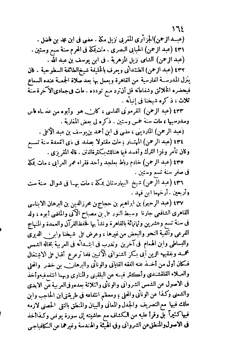 435 - عبد الرَّحْمَن / خَادِم رِبَاط بعلجد وَأحد فُقَرَاء عمر العرابي، مَاتَ بِمَكَّة فِي صفر سنة تسع وَسِتِّينَ.) :::