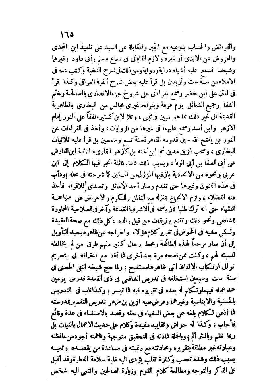 والفرائض والحساب بنوعيه مَعَ الْجَبْر والمقابلة عَن السَّيِّد على تلميذ ابْن المجدي وَالْعرُوض عَن الأبدي أَو غَيره ولازم القاياتي فِي سَماع مُسلم وَأبي دَاوُد وَغَيرهمَا وَشَيخنَا فَسمع عَلَيْهِ أَشْيَاء دراية وَرِوَايَة وَمن ذَلِك فِي شرح النخبة وَكتب عَنهُ فِي الاملاء من سنة سِتّ وَأَرْبَعين بل قَرَأَ عَلَيْهِ بعض شرح ألفية الْعِرَاقِيّ وَكَذَا قَرَأَ فِي الْمَتْن على ابْن خضر وَسمع بِقِرَاءَتِي على شُيُوخ جُزْء الْأنْصَارِيّ بالصالحية وَختم الشفا وَجَمِيع الشَّمَائِل يَوْم عَرَفَة وبقراءة غَيْرِي مجَالِس من البُخَارِيّ بالظاهرية الْقَدِيمَة إِلَى غير ذَلِك مِمَّا هُوَ مُبين فِي ثبتي، وتلا لِابْنِ كثير مُلَفقًا على النُّور إِمَام الْأَزْهَر وَابْن أَسد وَسمع عَلَيْهِمَا فِي غَيرهَا من الرِّوَايَات، وَأخذ فِي الْقرَاءَات عَن النُّور بن يفتح الله حِين قدومه الْقَاهِرَة سنة تسع وَخمسين بل قَرَأَ عَلَيْهِ ثلاثيات البُخَارِيّ، وَصَحب الزين مَدين ثمَّ ابْن أُخْته بل كَانَ هُوَ القارىء لتائية ابْن الفارض على أبي الصَّفَا بن أبي الوفا، وبسبب ذَلِك كَانَت كائنة انجر فِيهَا الْكَلَام إِلَى ابْن عَرَبِيّ وَنَحْوه من الاتحادية بَان فِيهَا المزلزل من المكين كَمَا شرحته فِي مَحَله ودأب فِي هَذِه الْفُنُون وَغَيرهَا حَتَّى تقدم وَصَارَ أحد الأماثل وتصدى للاقراء فَأخذ عَنهُ الْفُضَلَاء، وَلزِمَ الانجماع بِمَنْزِلَة مَعَ)