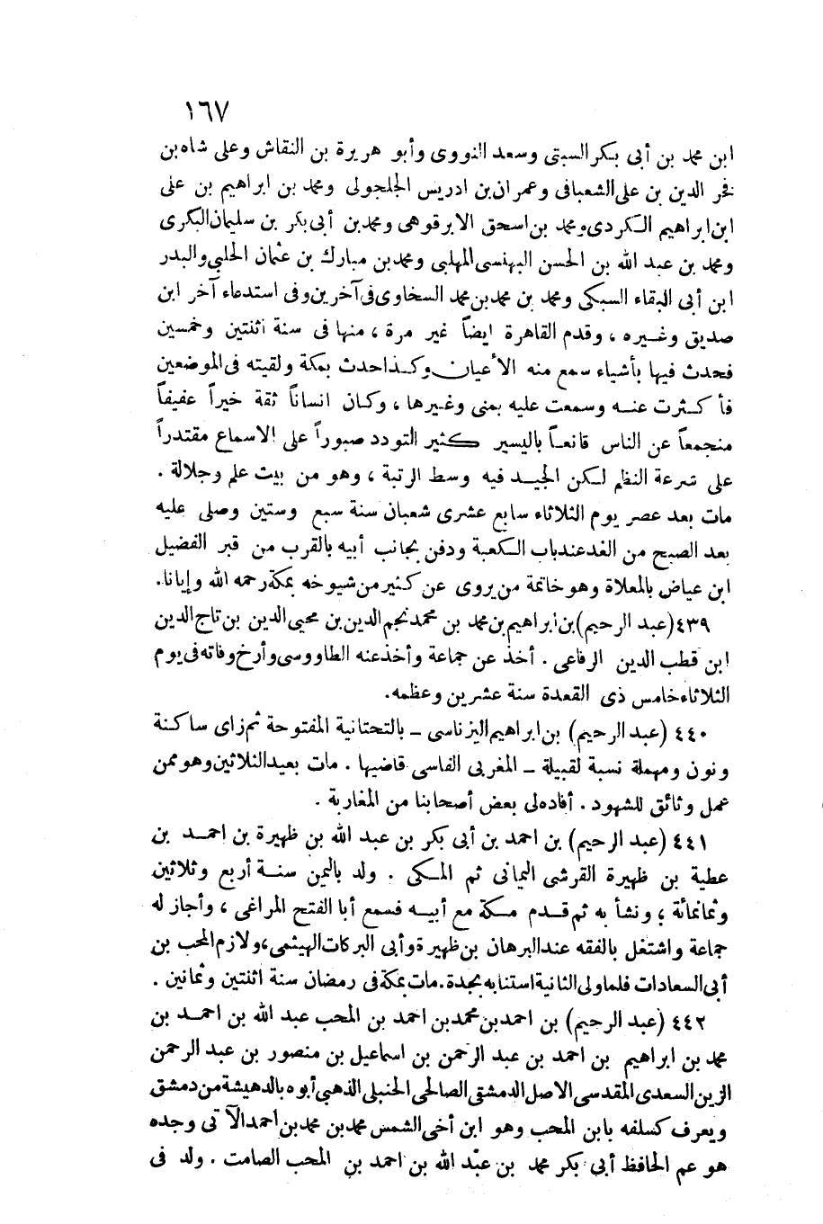 439 - عبد الرَّحِيم بن إِبْرَاهِيم بن مُحَمَّد بن مُحَمَّد بن نجم الدّين بن مُحي الدّين بن تَاج الدّين ابْن قطب الدّين الرِّفَاعِي. / أَخذ عَن جمَاعَة وَأخذ عَنهُ الطاووسي وأرخ وَفَاته فِي يَوْم الثُّلَاثَاء خَامِس ذِي الْقعدَة سنة عشْرين وعظمه.