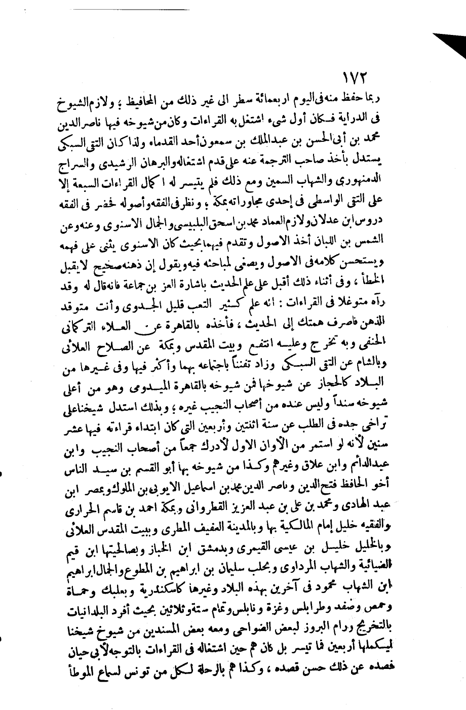 رُبمَا حفظ مِنْهُ فِي الْيَوْم أَرْبَعمِائَة سطر إِلَى غير ذَلِك من المحافيظ ولازم الشُّيُوخ فِي الدِّرَايَة فَكَانَ أول شَيْء اشْتغل بِهِ الْقرَاءَات وَكَانَ من شُيُوخه فِيهَا نَاصِر الدّين مُحَمَّد بن أبي الْحسن بن عبد الْملك بن سمعون أحد القدماء وَلذَا كَانَ التقي السُّبْكِيّ يسْتَدلّ بِأخذ صَاحب التَّرْجَمَة عَنهُ على قدم اشْتِغَاله والبرهان الرَّشِيدِيّ والسراج الدمنهوري والشهاب السمين وَمَعَ ذَلِك فَلم يَتَيَسَّر لَهُ إِكْمَال الْقرَاءَات السَّبْعَة إِلَّا على التقي الوَاسِطِيّ فِي إِحْدَى مجاوراته بِمَكَّة)