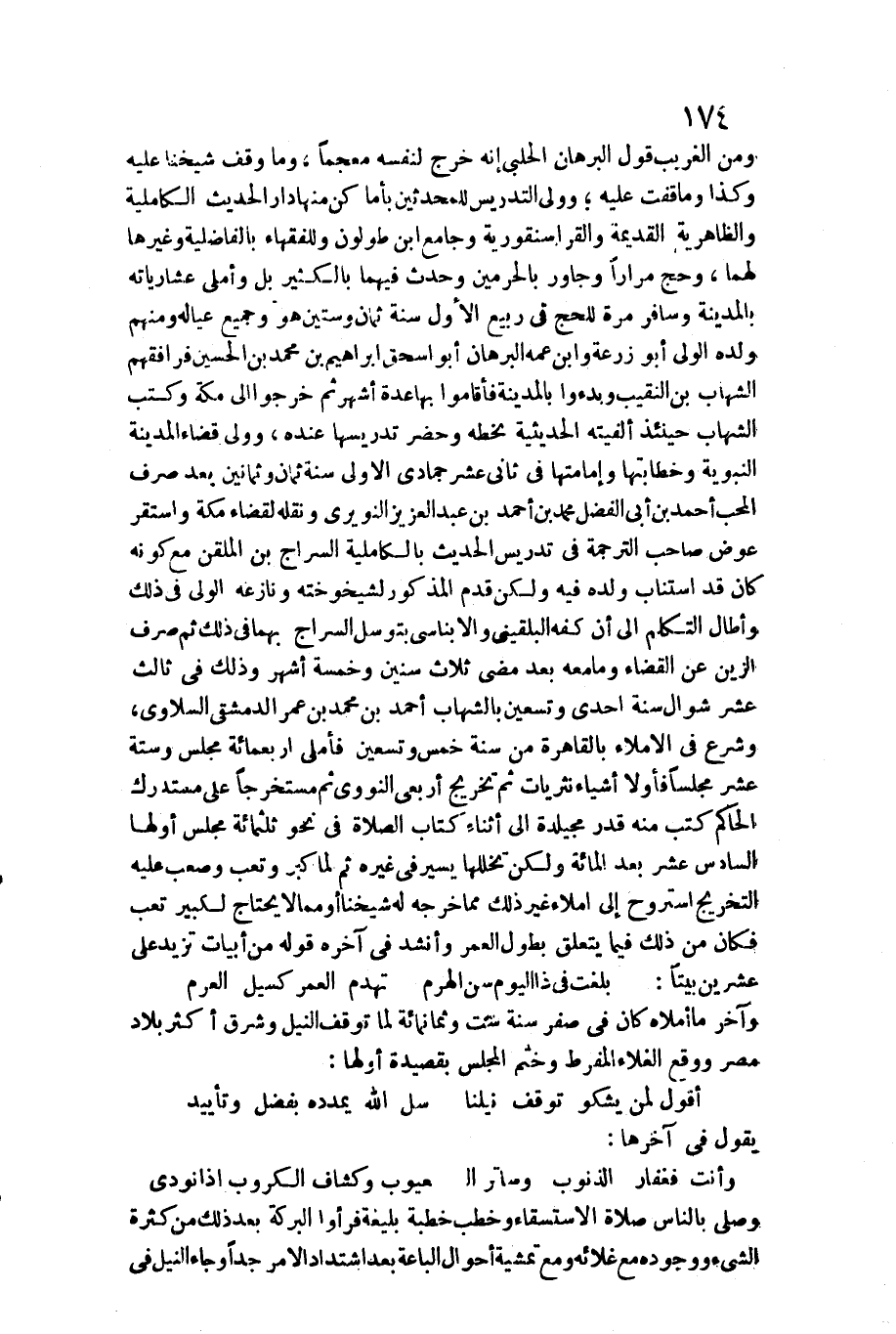 وَآخر مَا أملاه كَانَ فِي صفر سنة سِتّ وَثَمَانمِائَة لما توقف النّيل وشرق أَكثر بِلَاد مصر وَوَقع الغلاء المفرط وَختم الْمجْلس بقصيدة أَولهَا: