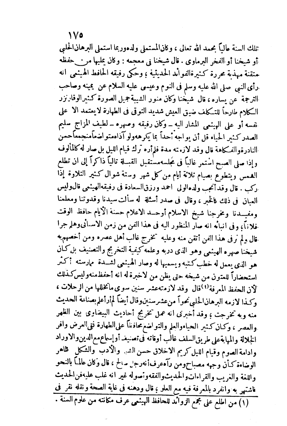 الحديثية وَحكى رَفِيقه الْحَافِظ الهيثمي أَنه رأى النَّبِي صلى الله عَلَيْهِ وَسلم فِي النّوم وَعِيسَى عَلَيْهِ السَّلَام عَن يَمِينه وَصَاحب التَّرْجَمَة عَن يسَاره، قَالَ شَيخنَا وَكَانَ منور الشيبة جميل الصُّورَة كثير الْوَقار نزر الْكَلَام طارحا للتكلف ضيق الْعَيْش شَدِيد التوقي فِي الطَّهَارَة لَا يعْتَمد الا على نَفسه أَو على الهيثمي الْمشَار إِلَيْهِ وَكَانَ رَفِيقه وصهره لطيف المزاج سليم الصَّدْر كثير الْحيَاء قل أَن يواجه أحدا بِمَا يكرههُ وَلَو آذاه متواضعا منجمعا حسن النادرة والفكاهة قَالَ وَقد لازمته مُدَّة فَلم أره ترك قيام اللَّيْل بل صَار لَهُ كالمألوف وَإِذا صلى الصُّبْح اسْتمرّ غَالِبا فِي مَجْلِسه مُسْتَقْبل الْقبْلَة تاليا ذَاكِرًا إِلَى أَن تطلع الشَّمْس ويتطوع بصياع ثَلَاثَة أَيَّام من كل شهر وَسِتَّة شَوَّال كثير التِّلَاوَة إِذا ركب. قَالَ وَقد أَنْجَب وَلَده الْوَلِيّ أَحْمد ورزق السَّعَادَة فِي رَفِيقه الهيثمي قَالَ وَلَيْسَ العيان فِي ذَلِك كالخبر، وَقَالَ فِي صدر اسئلة لَهُ سَأَلت سيدنَا وقدوتنا ومعلمنا ومفيدنا ومخرجنا شيخ الاسلام أوحد الاعلام حَسَنَة الْأَيَّام حَافظ الْوَقْت فلَانا وَفِي أنبائه إِنَّه صَار المنظور إِلَيْهِ فِي هَذَا الْفَنّ من زمن الأسبائي وهلم جرا قَالَ وَلم نر فِي هَذَا الْفَنّ أتقن مِنْهُ وَعَلِيهِ يخرج غَالب أهل عصره وَمن أخصهم بِهِ شَيخنَا صهره الهيثمي وَهُوَ الَّذِي دربه وَعلمه كَيْفيَّة التَّخْرِيج والتصنيف بل كَانَ هُوَ الَّذِي يعْمل لَهُ خطب كتبه ويسميها لَهُ وَصَارَ الهيثمي لشدَّة ممارسته أَكثر استحضارا للمتون من شَيْخه حَتَّى يظنّ من لَا خبْرَة لَهُ إِنَّه أحفظ مِنْهُ وَلَيْسَ كَذَلِك لِأَن الْحِفْظ الْمعرفَة قَالَ وَقد لازمته عشر سِنِين سوى مَا تخللها من الرحلات، وَكَذَا لَازمه الْبُرْهَان الْحلَبِي نَحوا من عشر سِنِين وَقَالَ أَيْضا لم أر أعلم بصناعة الحَدِيث مِنْهُ وَبِه تخرجت وَقد أَخْبرنِي إِنَّه عمل تَخْرِيج أَحَادِيث الْبَيْضَاوِيّ بَين الظّهْر وَالْعصر، وَكَانَ كثير الْحيَاء وَالْعلم والتواضع محافظا على الطَّهَارَة نقي الْعرض وافر الْجَلالَة والمهابة على طَرِيق السّلف غَالب أوقاته فِي تصنيف أَو إسماع مَعَ الدّين والأوراد وإدامة الصَّوْم وَقيام اللَّيْل كريم الْأَخْلَاق حسن الشّرف وَالْأَدب والشكل ظَاهر الْوَضَاءَة كَأَن وَجهه مِصْبَاح وَمن رَآهُ عرف أَنه رجل صَالح، قَالَ وَكَانَ عَالما بالنحو واللغة والغريب والقراءات والْحَدِيث وَالْفِقْه وأصوله غير إِنَّه غلب عَلَيْهِ فن الحَدِيث فاشتهر بِهِ وَانْفَرَدَ بالمعرفة فِيهِ مَعَ الْعُلُوّ قَالَ ودهنه فِي غَايَة الصِّحَّة وَنَقله نقر فِي